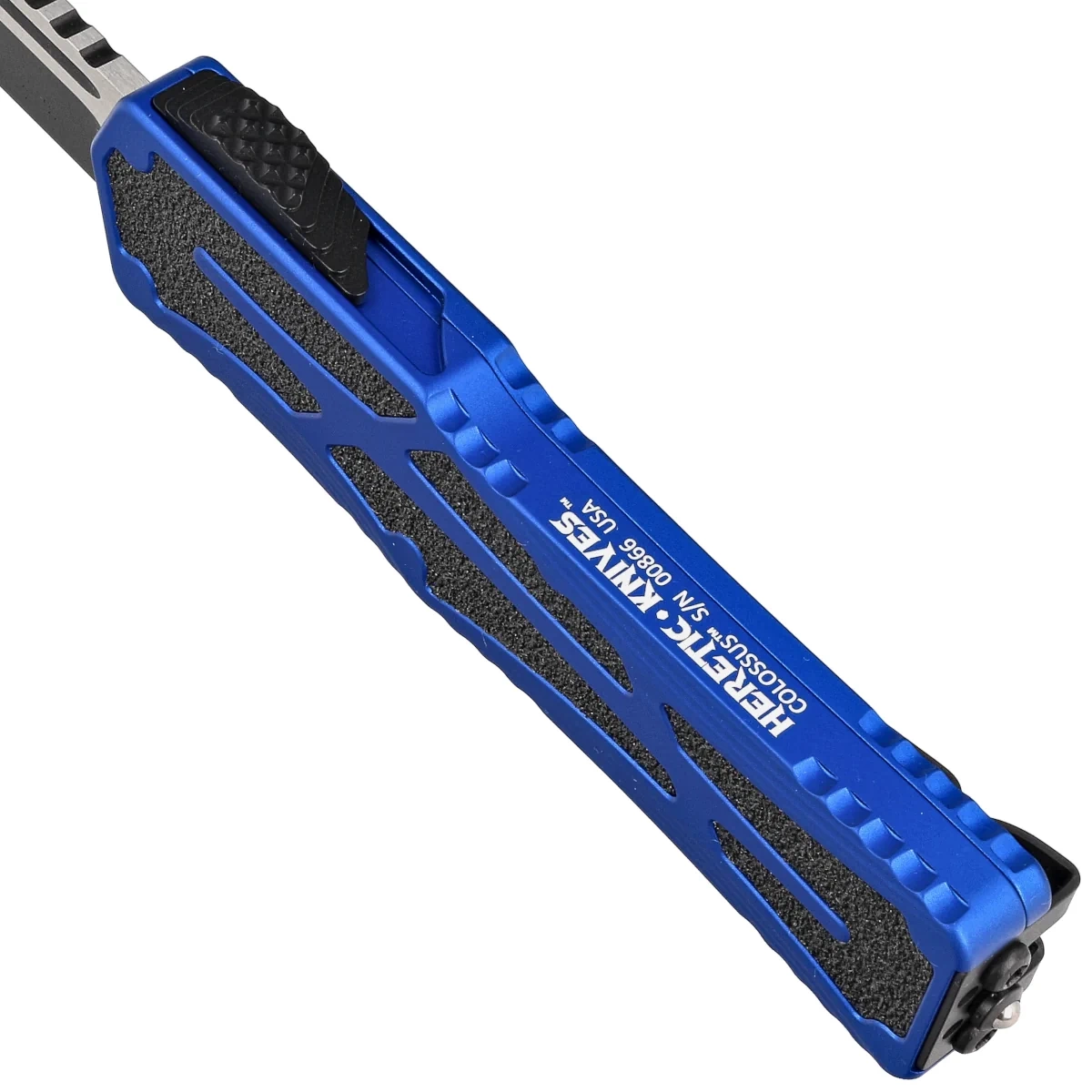 Colossus SE Blue Aluminium, Cerakote Two Tone Black one of the best OTF (Out The Front) automatic knives. It features the excellent fit and finish you would expect from a top of the range knife. The over-the-top automatic works in D/A (Double Action) mode using the knife's patent-pending opening mechanism, which works with great force and power. The mechanism uses ball bearings to reduce friction and ensure fast, smooth blade locking. Grip enhancing inserts on both sides of the aluminium Handle provide both style and functionality. Designed by Anthony Marfione Jr. owner of Heretic Knives.