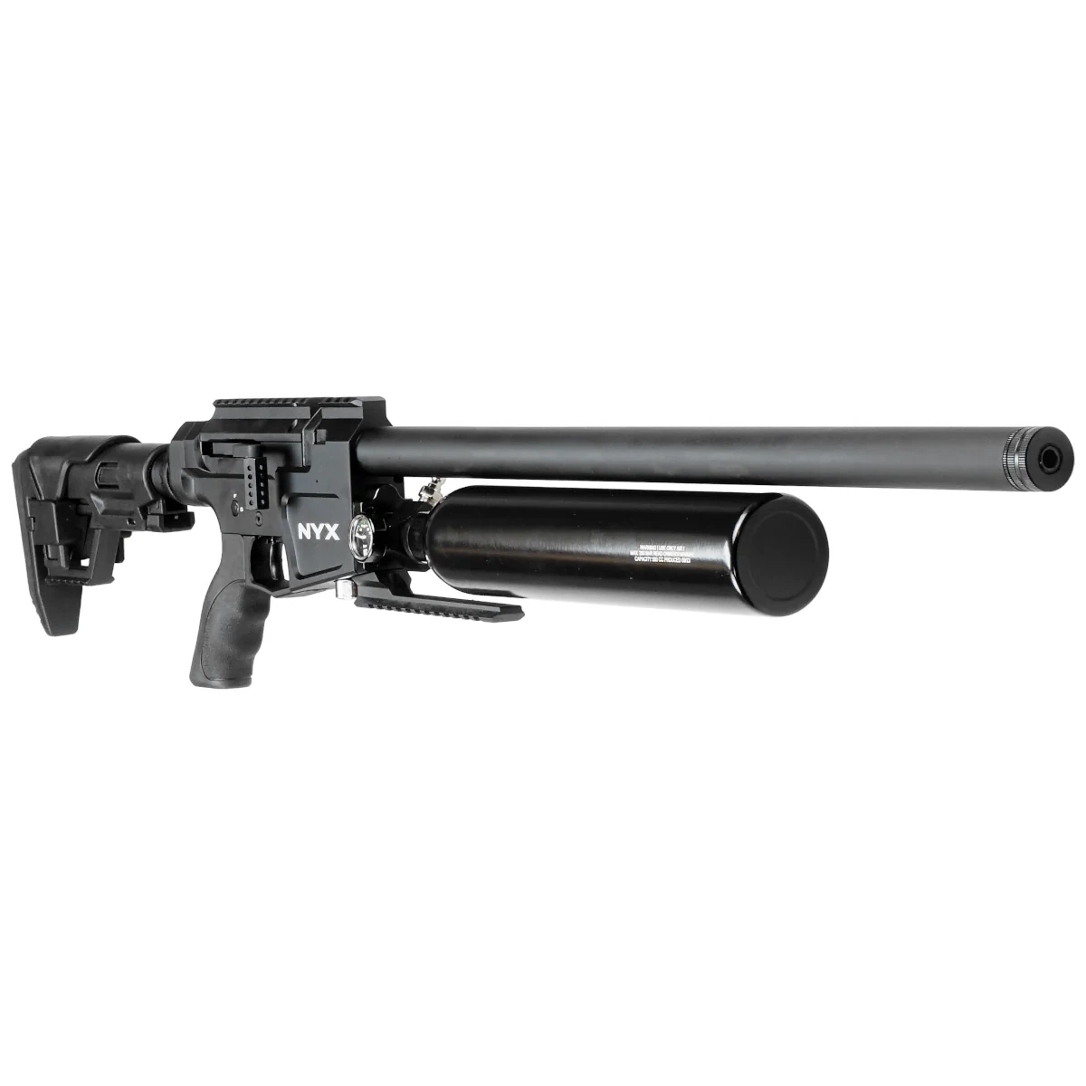 • Reximex NYX, modern tactical multi-shot PCP rifle with Side Lever reloading, regulator, fully adjustable AR telescopic stock and barrel with integrated moderator. Available in calibers: 4.5mm, 5.5mm, 6.35mm
