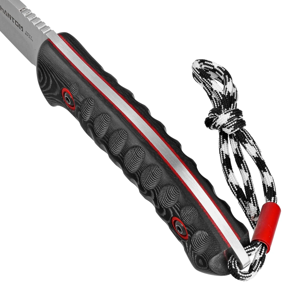 Phantom Black Micarta, Satin a large hunting/tactical knife with full tang construction in X50CrMoV15 steel. The steel has undergone CRYO-T cryogenic treatment, also known as steel freezing. This improves the hardness and strength of the blade. Handle made of micarta, with red accents!