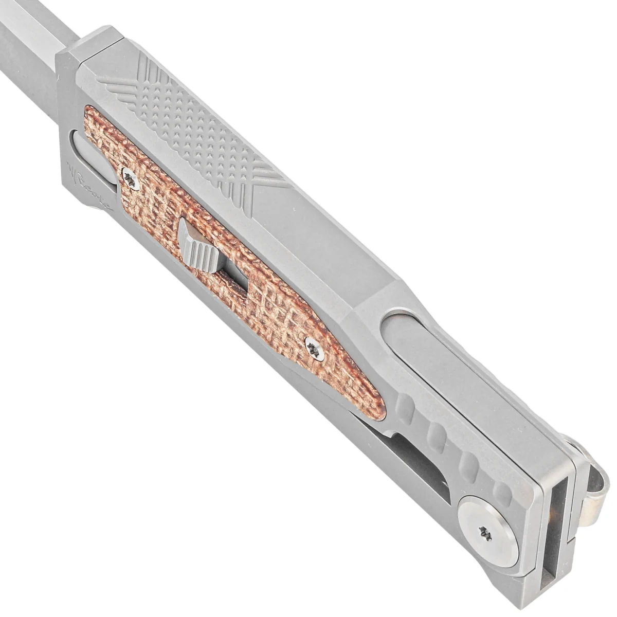Handle - CNC-milled titanium Exoskeleton, an external skeleton with a movable top section responsible for opening and closing the knife. The chamfered edges of the sheaths eliminate sharp edges, and the perfectly matched Burlap micarta inlays add an exclusive touch and improve grip security. On the right side, an artful sliding lock slider for advancing/retracting the blade. Once it is moved to the secure "lock" position, the knife will not be opened/closed by accident. A single-position titanium (right) deep-carry clip allows you to discreetly carry the knife in your pocket in tip-down position (blade tip down).