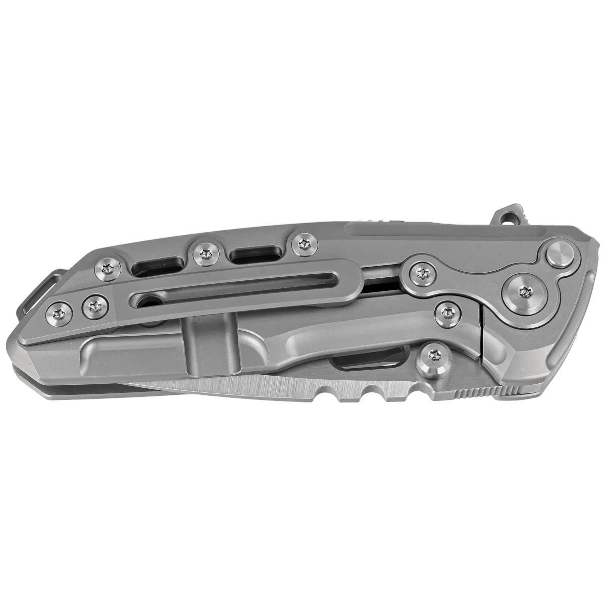 Handle - made of solid titanium 6AL4V, perfectly milled on CNC machine tools. Contouring of the cover eliminates sharp edges. Only a few companies are able to make the Handle with such incredible accuracy! The grips are joined together with a titanium backspacer. A single-position clip (right), made of titanium, allows the knife to be carried in tip-up position. On the back, a slide releases an additional lock in the form of two steel cylinders located above the pivot. The lock also works when the knife is closed, preventing accidental opening. The protruding section of the backspacer can be used as an improvised glass breaker, and also has a hole for a safety or decorative cord.