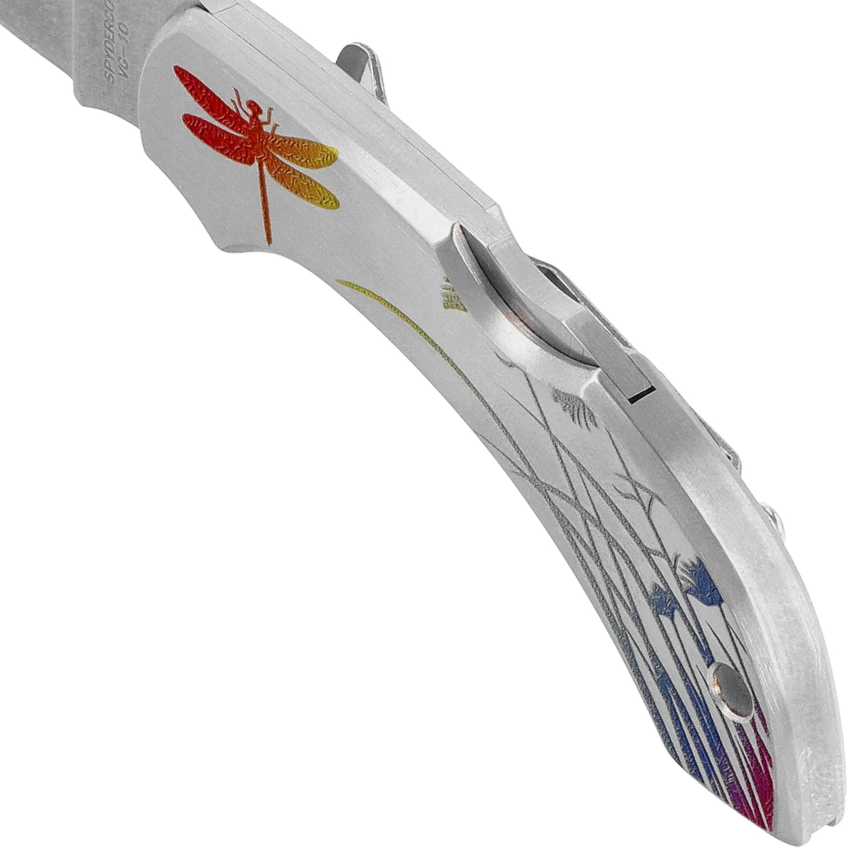 DragonFly Tattoo Stainless, Satin compact EDC folding knife with beautiful dragonfly engraving. Thanks to the excellent ergonomics of the grip and the ratio of the head to the handle, we get the impression of working with a larger folder. The knife's cutting capabilities are surprising compared to its petite appearance and innocent name DragonFly. A display of artistry from designer and founder of Spyderco, Sal Glesser!