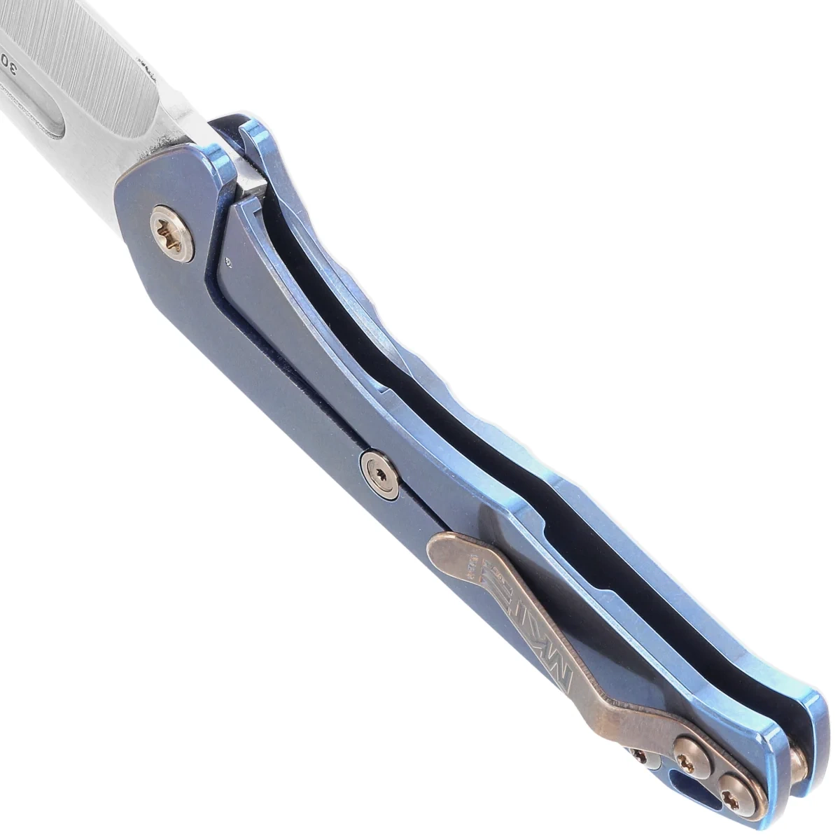 The elite Imperial Praetorian Guard was a unit into which the best of the Roman legionaries were selected to serve as the Emperor's personal protection. The MKT Praetorian Slim PVD Tumbled Drop Point, Blue Handle, Bronze HW/Clipp slimmer version of the flagship, is still just such an elite knife. Its amazing design is limited only by the strength of its materials. With a 3.8mm thick blade, solid 3.2mm aluminum/titanium grips and 6.35mm thick pivots and screws, it stands out from other knives. Beautiful form and function, unrivaled reliability, this is a knife for enthusiasts who do not recognize compromise and demand the highest standards!