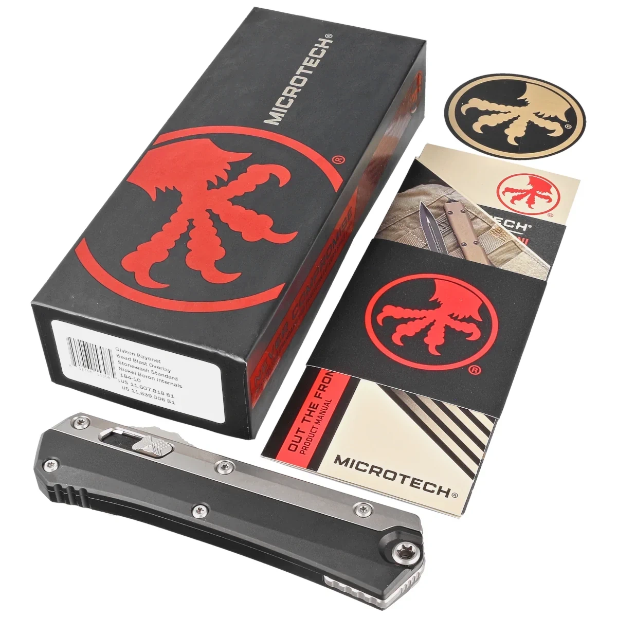 Glykon D/E Bayonet Black Aluminium / Bead Blast Titanium, Stonewashed is a large OTF (Out The Front) automatic knife from the Glykon series. The first automatic with a Tri-Sided button, allowing complete ambidextrous operation, equipped with a hell of a fast mechanism that extends the razor-sharp blade. 100% made and assembled in the USA. Designed by Anthony and Sean Marfione of Microtech Knives.