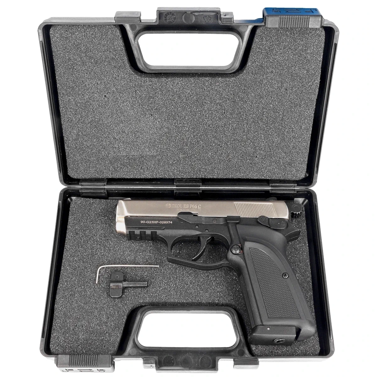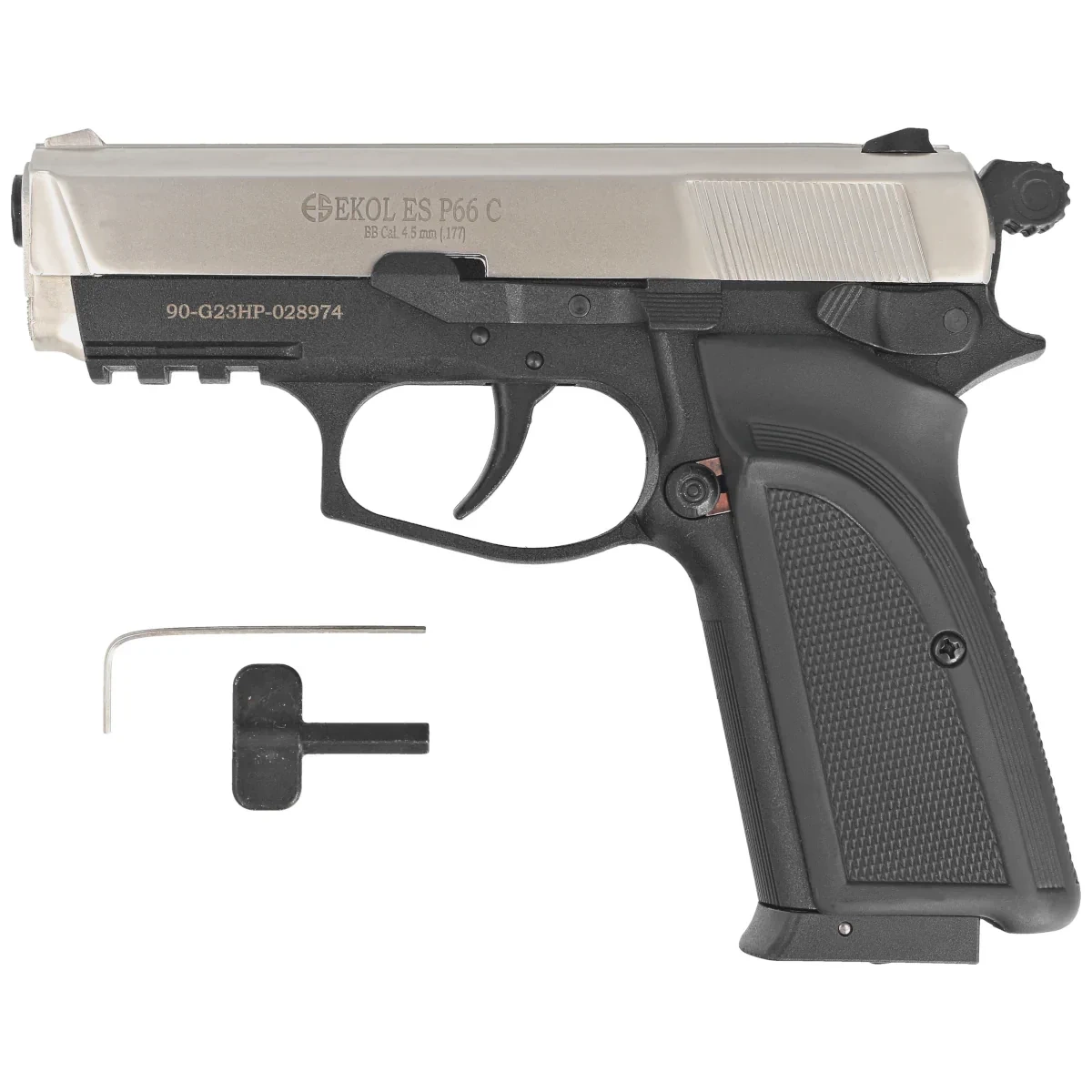 - Ekol ES P66C Satin compact and ultra-lightweight semi-automatic air pistol, structurally based on a blank pistol. With such strong roots, this powerful airgun reaching a velocity of 135 m/s, is well-suited for dynamic sport shooting and tactical training.