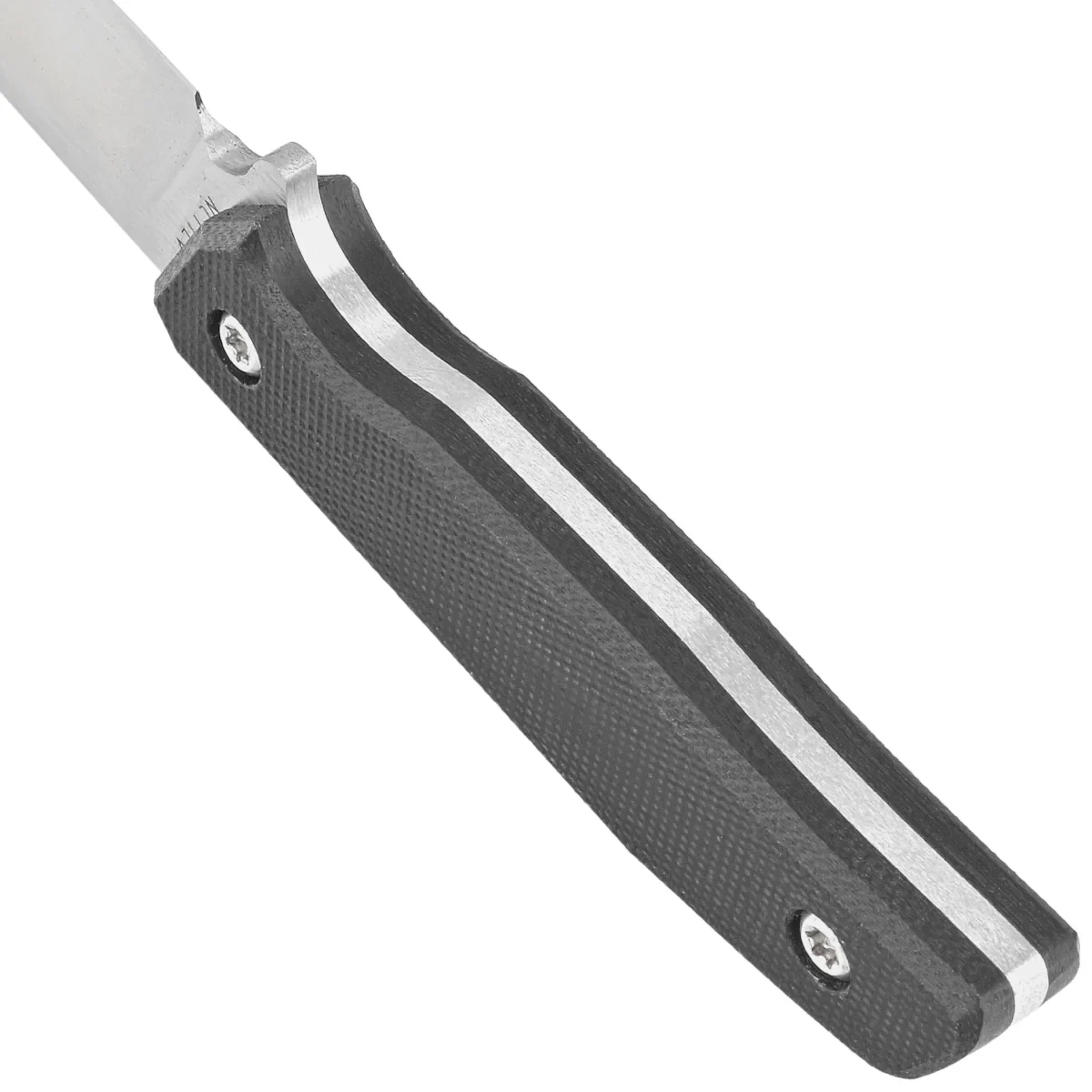 Handle - covered with durable G10 (fiberglass pressed with synthetic resin) grips in black, with a slightly rough surface. They provide excellent ergonomics and a secure grip. The symmetrical design of the Handle allows the knife to be held both ways, especially for users who appreciate an inverted grip. A series of holes not only visually gives lightness to the Handle, but also subtracts the real weight of the knife.