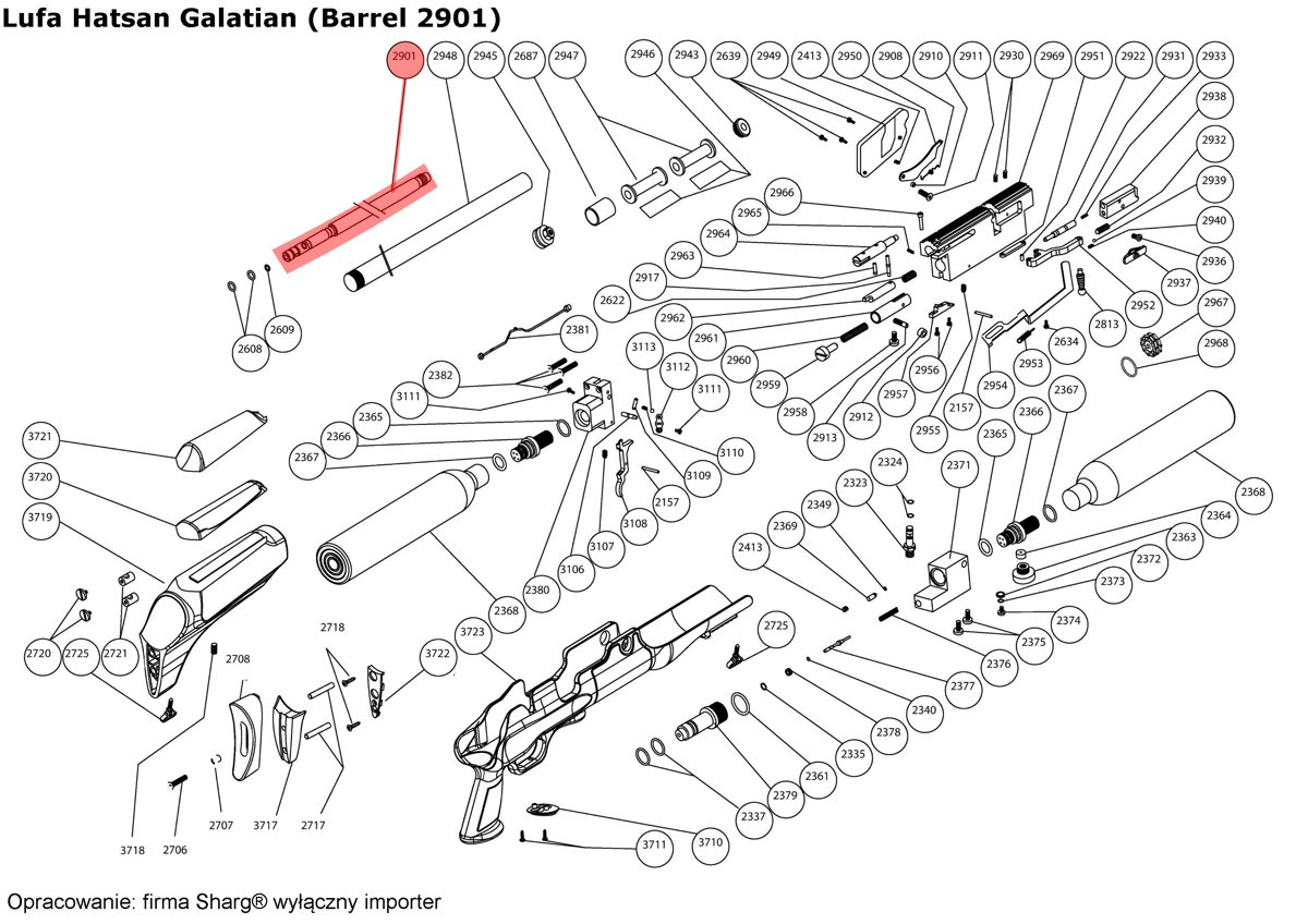 • 2901 - (service) 23" (585 mm) precision threaded barrel from Hatsan Arms. Designed for the powerful PCP Predator, Hercules and Galatian airguns. Barrels: 2901-1 caliber .177 (4.5 mm), 2901-2 caliber .22 (5.5 mm), 2901-3 caliber .25 (6.35mm).
