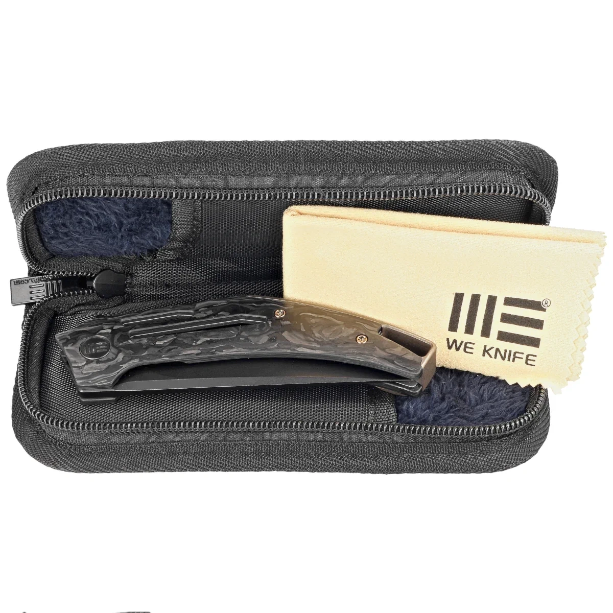 Handle - Shredded Carbon Fiber grips (carbon fiber compressed under pressure with synthetic resin) with a unique design. Attached to steel liners. Chamfered edges of the covers eliminate sharp edges. The sides were screwed to a solid titanium backspacer, giving assurance of many years of use. The pivot is decorated with a stylized WE Knife brand logo. A single-position (right) titanium deep-carry clip allows you to carry the knife discreetly in your pocket in tip-up (blade tip up) position. On the back of the Handle a lanyard hole, hidden in the backspacer, a place for a decorative or safety line.