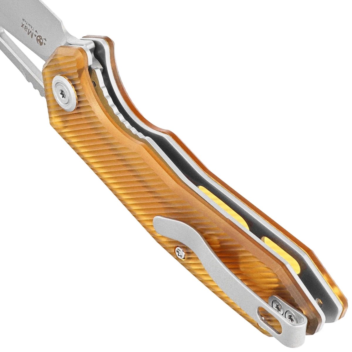 Handle - liners made of transparent Ultem™ plastic, textured for improved grip, bolted to the knife's steel frame. Chamfered edges of the sheaths eliminate sharp edges for comfort and improve grip confidence. The so-called open-backed design without the typical backspacer, fastened together with steel spacer sleeves for easy cleaning. The simple, secure design provides confidence for years of use. A deep finger undercut (fore finger groove) improves grip security. The pivot axis is decorated with a stylized Kubey Knife brand logo. A two-position (right.left) titanium deep carry clip allows you to carry the knife discreetly in your pocket in tip-up (blade tip up) position.