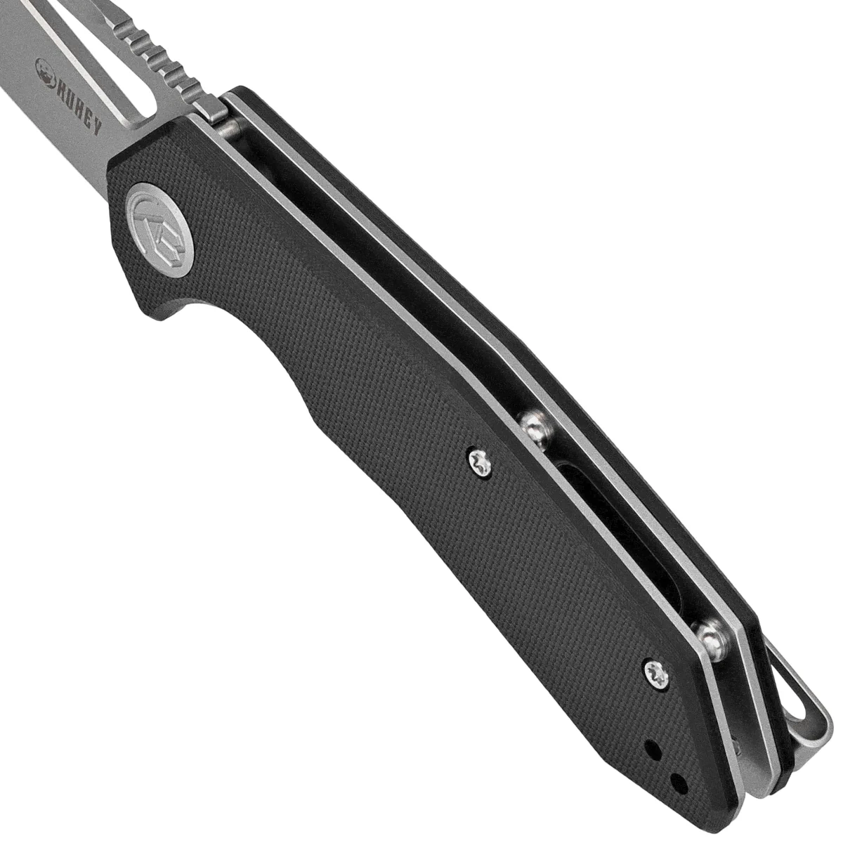 Handle - is two pieces of G10 composite (pressure-pressed fiberglass with synthetic resin), deeply textured to improve grip confidence, bolted to the knife's steel frame. Chamfered edges of the sheaths eliminate sharp edges for comfort and improve grip confidence. The so-called open-backed design without the typical backspacer, fastened together with steel spacers for easy cleaning. The simple, secure design gives confidence for years of use. A deep finger undercut (fore finger groove) improves grip security. The pivot axis is decorated with a stylized Kubey Knife brand logo. A two-position (right.left) titanium deep carry clip allows you to carry the knife discreetly in your pocket in tip-up (blade tip up) position.