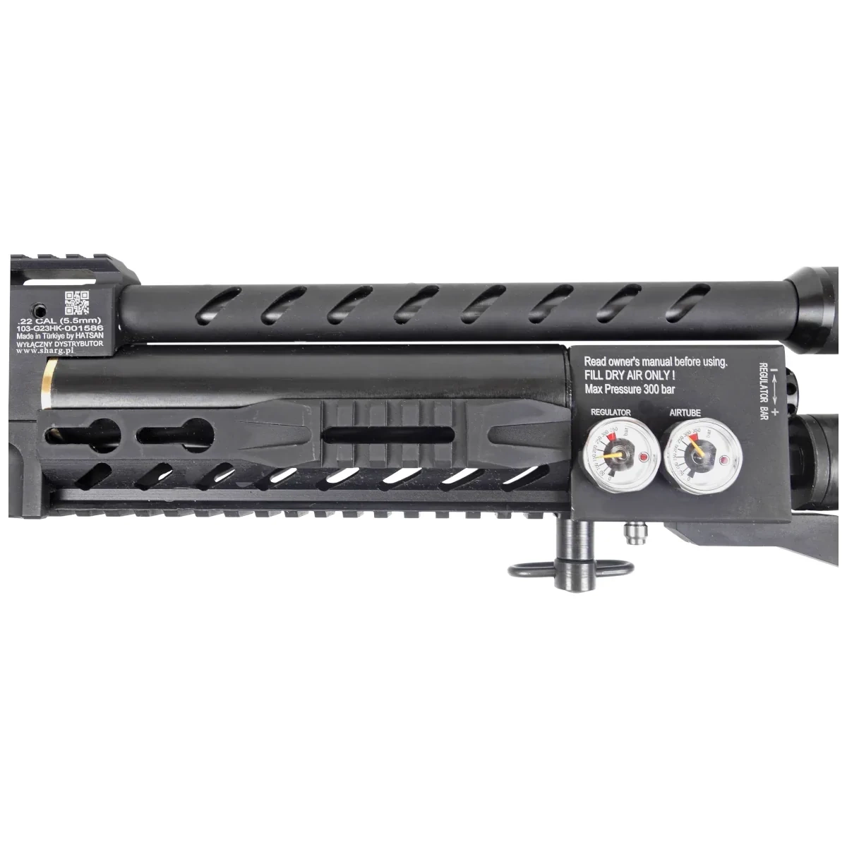FACTOR SNIPER S, the latest generation of air rifles from Hatsan. A PCP rifle with a practical tactical stock and pistol grip. Thanks to the AR-15 style telescopic stock and adjustable cheek rest, the rifle can be fully customized to your preferences. A lightweight 480cc 300-bar air cylinder is perfect for enthusiasts of extended shooting sessions without worrying about refilling. The air rifle features a precision rifled barrel with an integrated suppressorexternally adjustable pressure regulatoradjustable hammer preload, a biathlon-style Side Lever, dual optics rails (11 mm and 22 mm), and a match-grade trigger with adjustable pull weight and travel distance. Available calibers include: .177 (4.5 mm), .22 (5.5 mm), and .25 (6.35 mm).