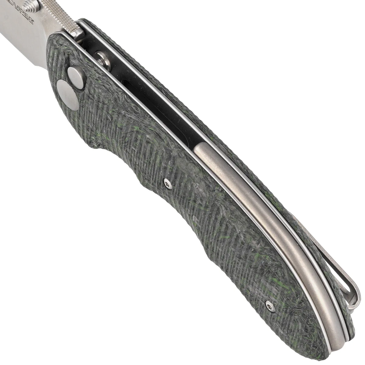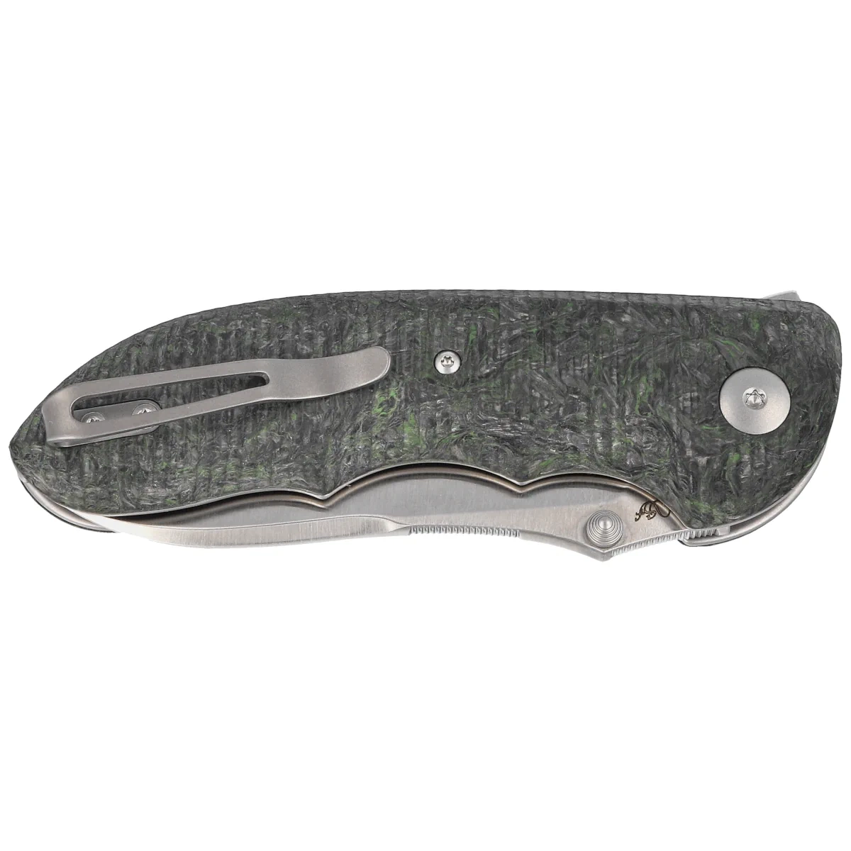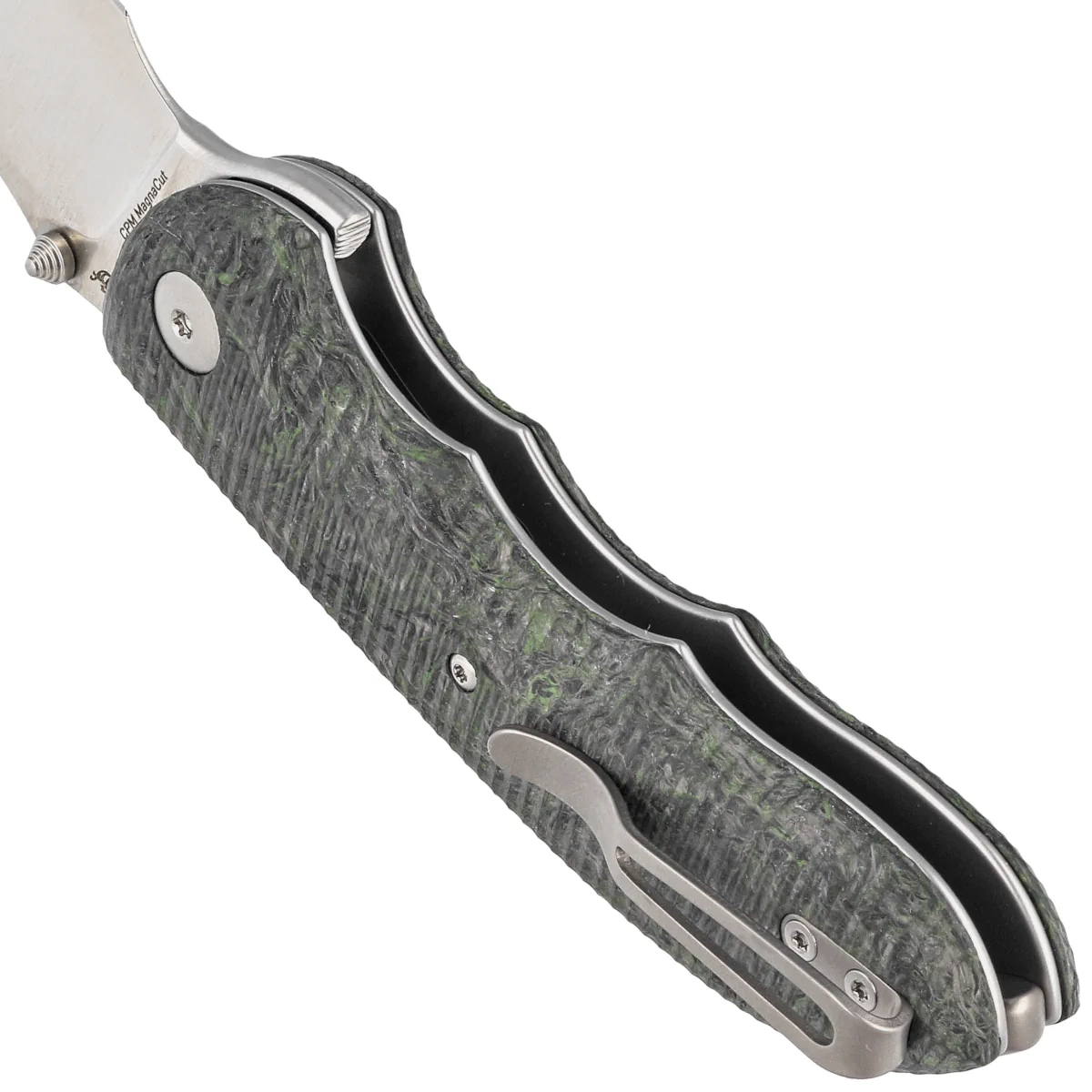 Handle - grips made of Dark Matter Green Carbon Fiber, a striking composite of carbon fiber and synthetic resin, a material virtually impervious to weather, heat and cold. A single-position (right) titanium clip allows you to carry the knife discreetly in your pocket in tip-up (blade tip up) position.