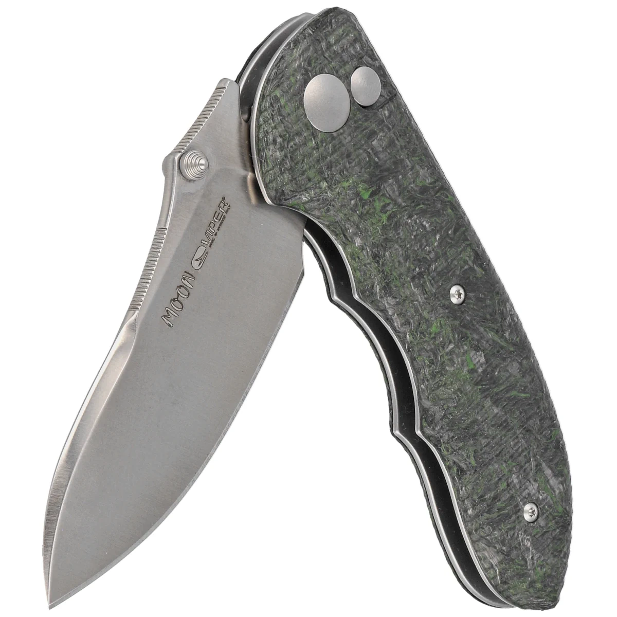 Moon Dark Matter Green Fat Carbon, Satin, folding knife designed by Fabrizio Silvestrelli. Intuitive button lock for gravity opening of the knife and ergonomic Handle made of almost indestructible Dark Matter Green Fat Carbon Fiber, composite. A powerful tool made of top materials, including the considered best steel for knives - MagnaCut!