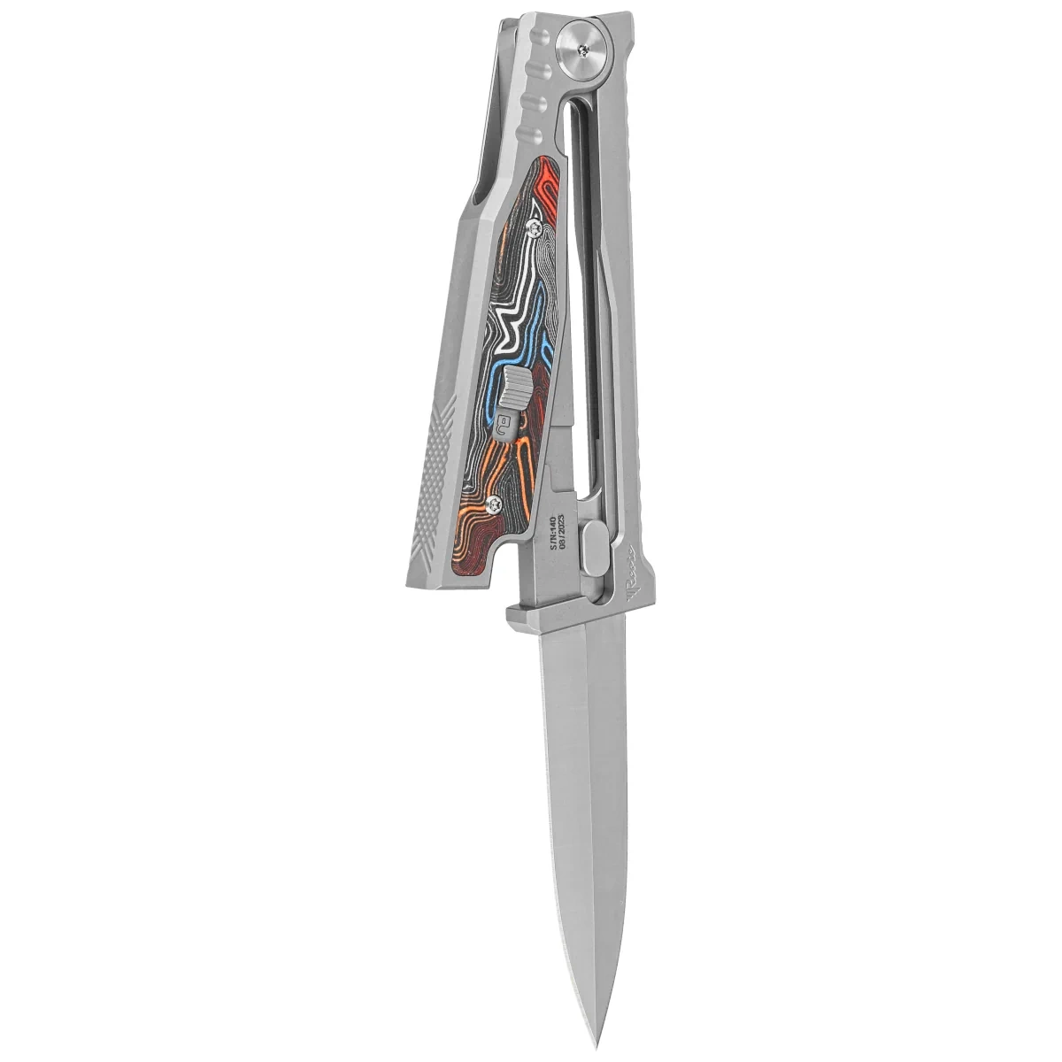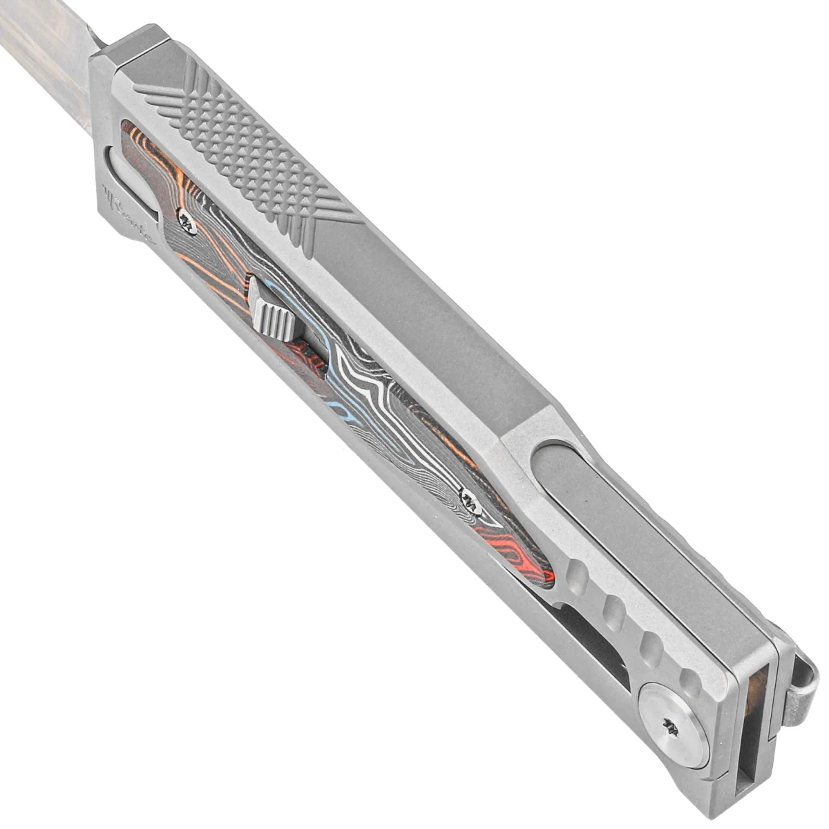 EXO-M Gravity D/E Bead Blasted Titanium/Damascus MultiColor G10, Satin is an intuitively opened, inventive EXO-M (Medium) folding knife from the legendary Reate Knives manufactory—a true showcase of engineering excellence in design. The EXO-M model features a front-deploying blade activated by the force of gravity. The construction is inspired by the Luftwaffe aviation gravity knife, commonly referred to as the German paratrooper knife. Intuitive one-handed blade deployment and retraction, driven by gravity, combined with the use of top-grade materials, result in a knife of unmatched quality characteristic of the Reate brand.