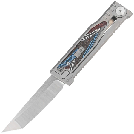 EXO-M Gravity T/E Bead Blasted Titanium/Damascus MultiColor G10, Satin is an intuitively opened, inventive EXO-M (Medium) folding knife from the legendary Reate Knives manufactory - a true showcase of engineering excellence in design. The EXO-M model features a front-deploying blade activated by the force of gravity. The construction is inspired by the Luftwaffe aviation gravity knife, commonly referred to as the German paratrooper knife. Intuitive one-handed blade deployment and retraction, driven by gravity, combined with the use of top-grade materials, result in a knife of unmatched quality characteristic of the Reate brand.