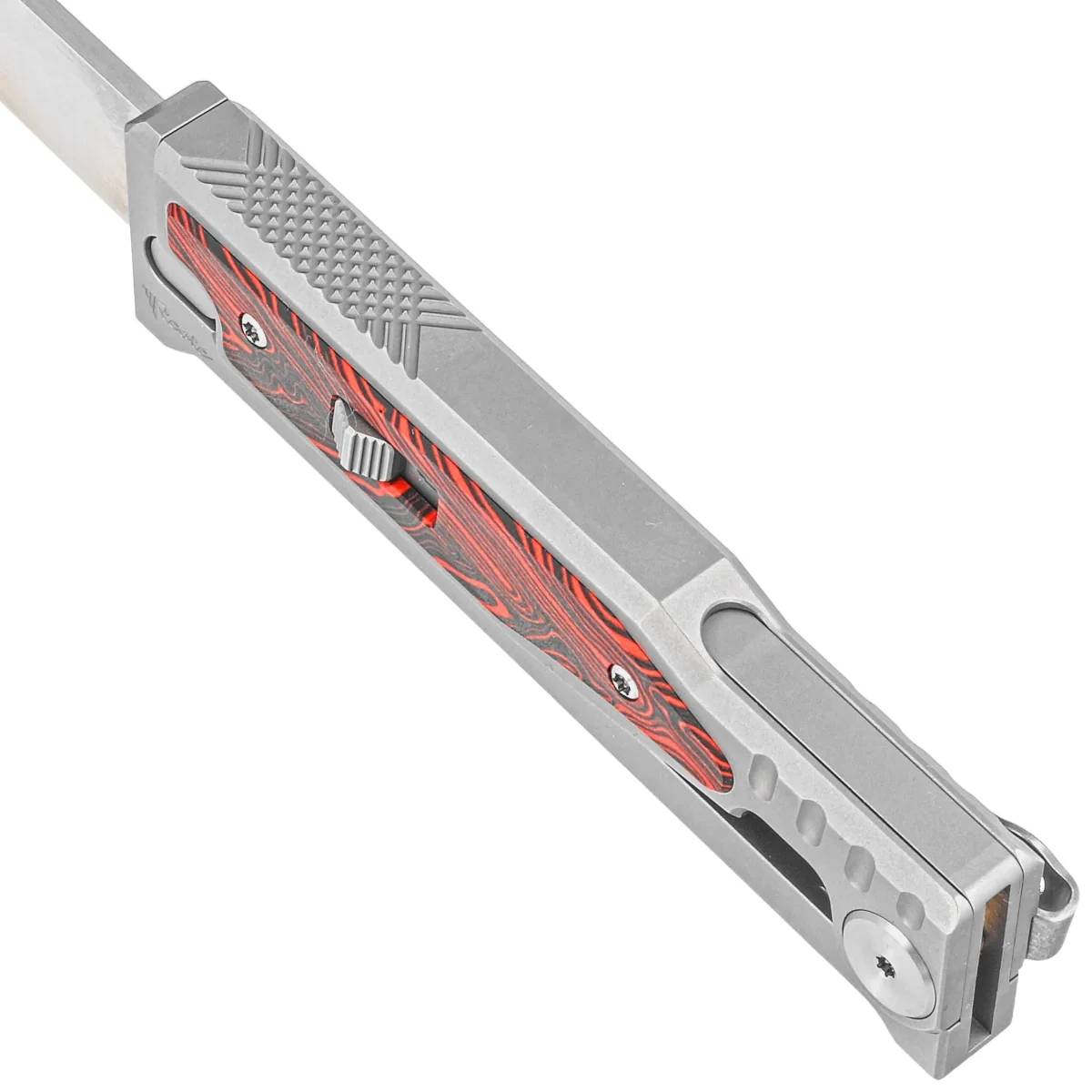 EXO-M Gravity Drop Point Bead Blasted Titanium/Damascus Red-Black G10, Satin is an intuitively opened, inventive EXO-M (Medium) folding knife from the legendary Reate Knives manufactory - a true showcase of engineering excellence in design. The EXO-M model features a front-deploying blade activated by the force of gravity. The construction is inspired by the Luftwaffe aviation gravity knife, commonly referred to as the German paratrooper knife. Intuitive one-handed blade deployment and retraction, driven by gravity, combined with the use of top-grade materials, result in a knife of unmatched quality characteristic of the Reate brand.