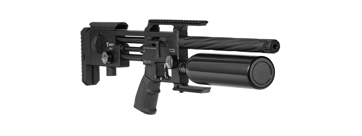 • Kuzey Gale – modern PCP ait rifle with an integrated suppressor and a 425 cc high-capacity air tube. Bullpup aluminum stock with adjustable cheekpiece and buttplate. Available in calibers 4.5, 5.5, and 6.35 mm.