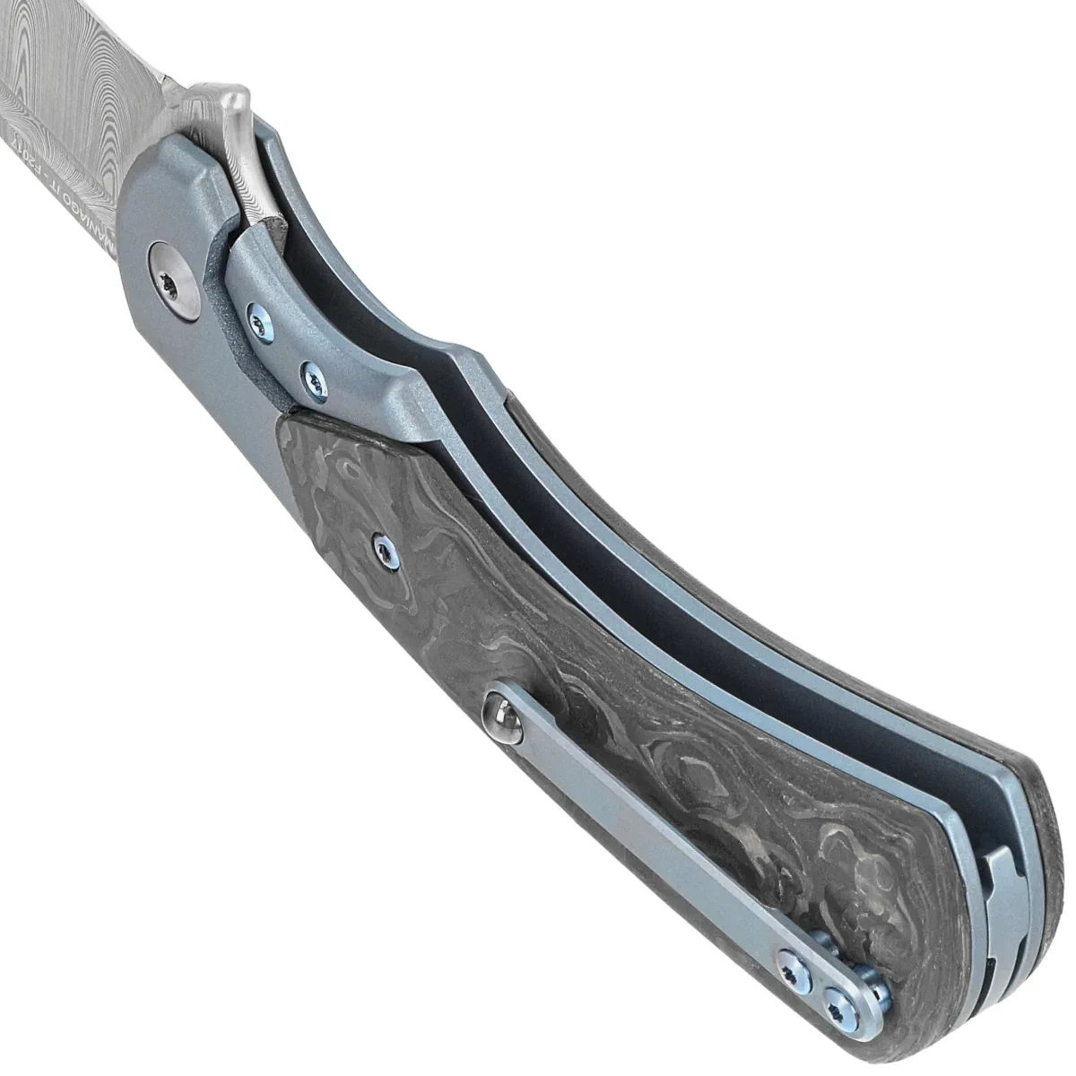 Handle - is a thick piece of 6AL4V titanium, beautifully milled with the help of CNC machine tools. On both sides there is an inlay (insert) made of Marble Carbon Fiber. The massive backspacer gives the whole structure the desired rigidity. The simplicity and solidity of the construction give the assurance of many years of use. The single-position clip (right), made of titanium, allows the knife to be carried in tip-up position. The pivot axis decorated with a titanium rim (pivot collar cap).