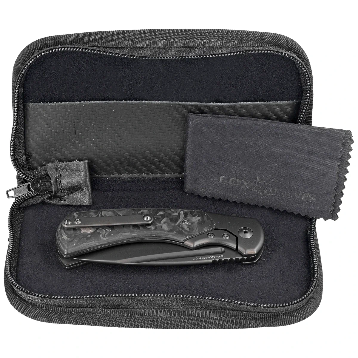 • Fox 40th Anniversary Knife Marble Carbon Fiber, Black PVD released on the occasion of the company's 40th anniversary is a reissue of the first folding knife produced by Fox, the 594 Silver Collection model. Made of the best materials and modern technology