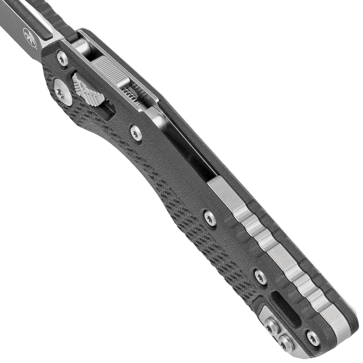 Handle - made of durable polymer, covered with Tri-Grip texture for better grip. Wide locking slide with Microtech's characteristic stepped X structure. Both grips are bolted together with a solid aluminum backspacer. The double-sided (right / left) clip allows you to discreetly carry the knife in tip-up position. Above the clip a lanyard hole, a place for a safety or decorative cord.