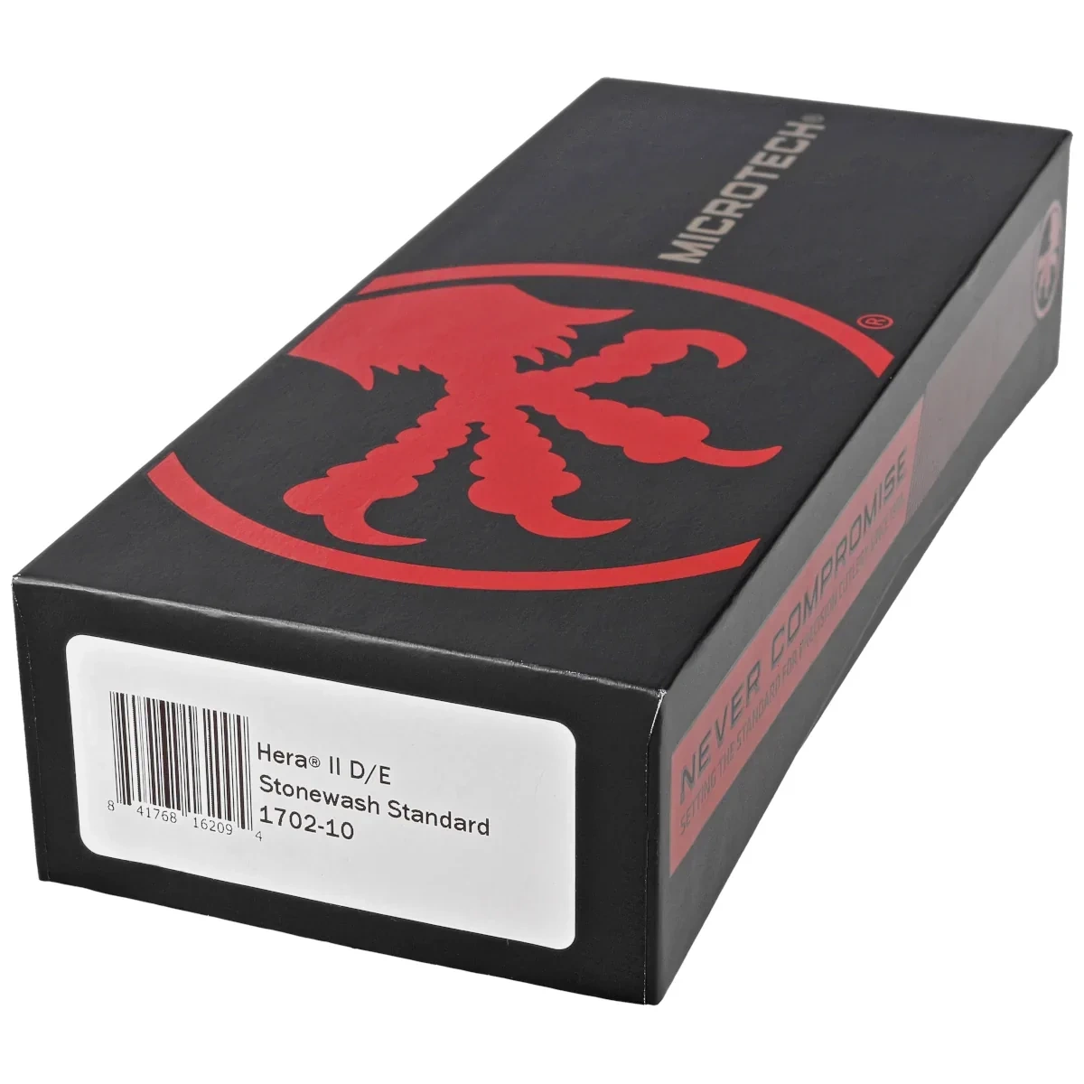Hera II D/E Black Aluminum, Stonewashed one of the most versatile OTF (Out The Front) automatic knives. Inspired by the iconic Troodon, it bridges the gap between EDC models and fully tactical designs. The exceptionally durable D/A (Double Action) mechanism provides fast, powerful, and reliable blade deployment and retraction. The knife stands out with its excellent fit, finish, and overall build quality. A design by Anthony Marfione, renowned knifemaker and owner of Microtech Knives.