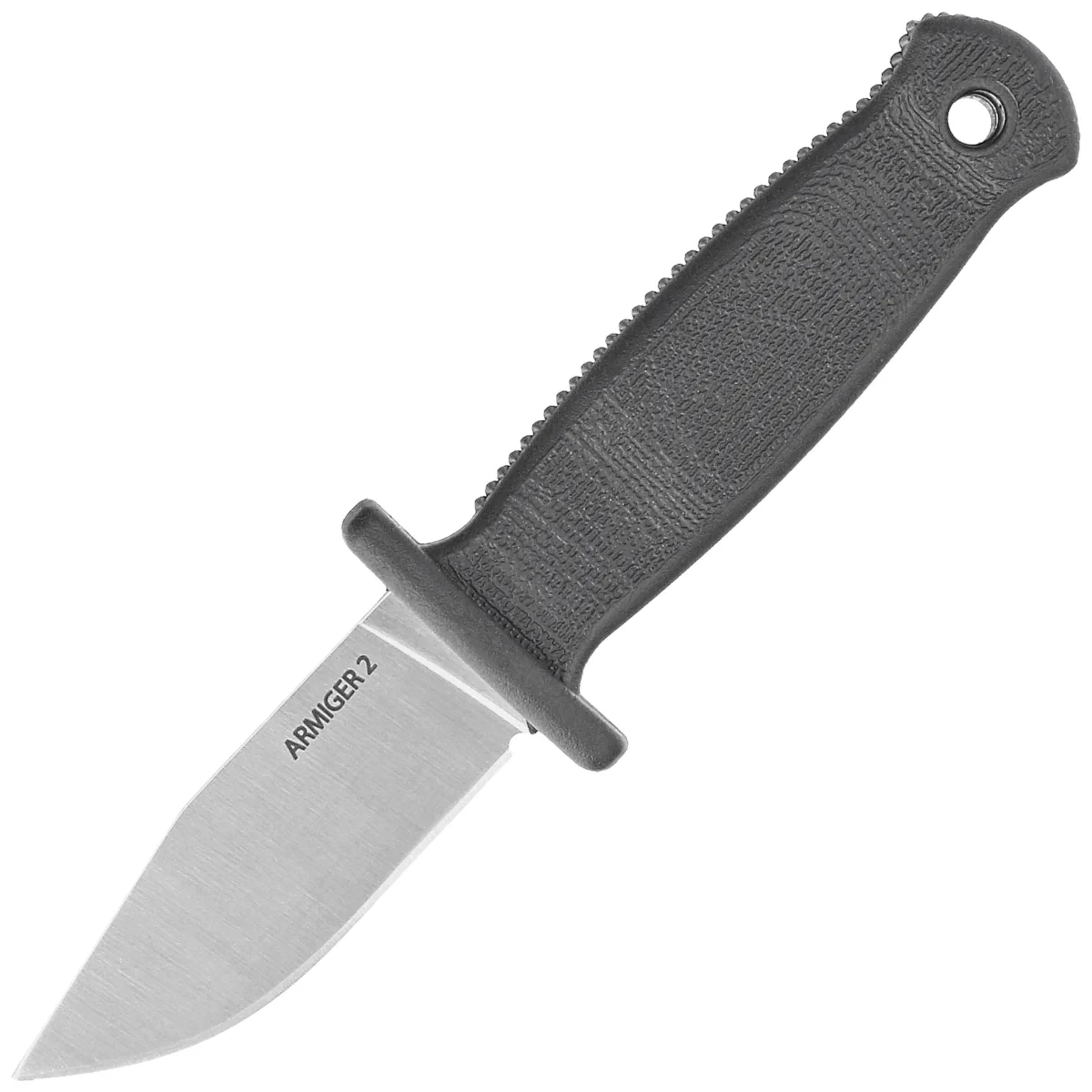 • Armiger 2 Clip Point Black Thermal Plastic Rubber, Satin, compact neck knife. Full tang construction, comfortable Handle for secure grip. Sheath made of kydex with carabiner. Designed by Cold Steel's longtime designer, Andrew Demko.