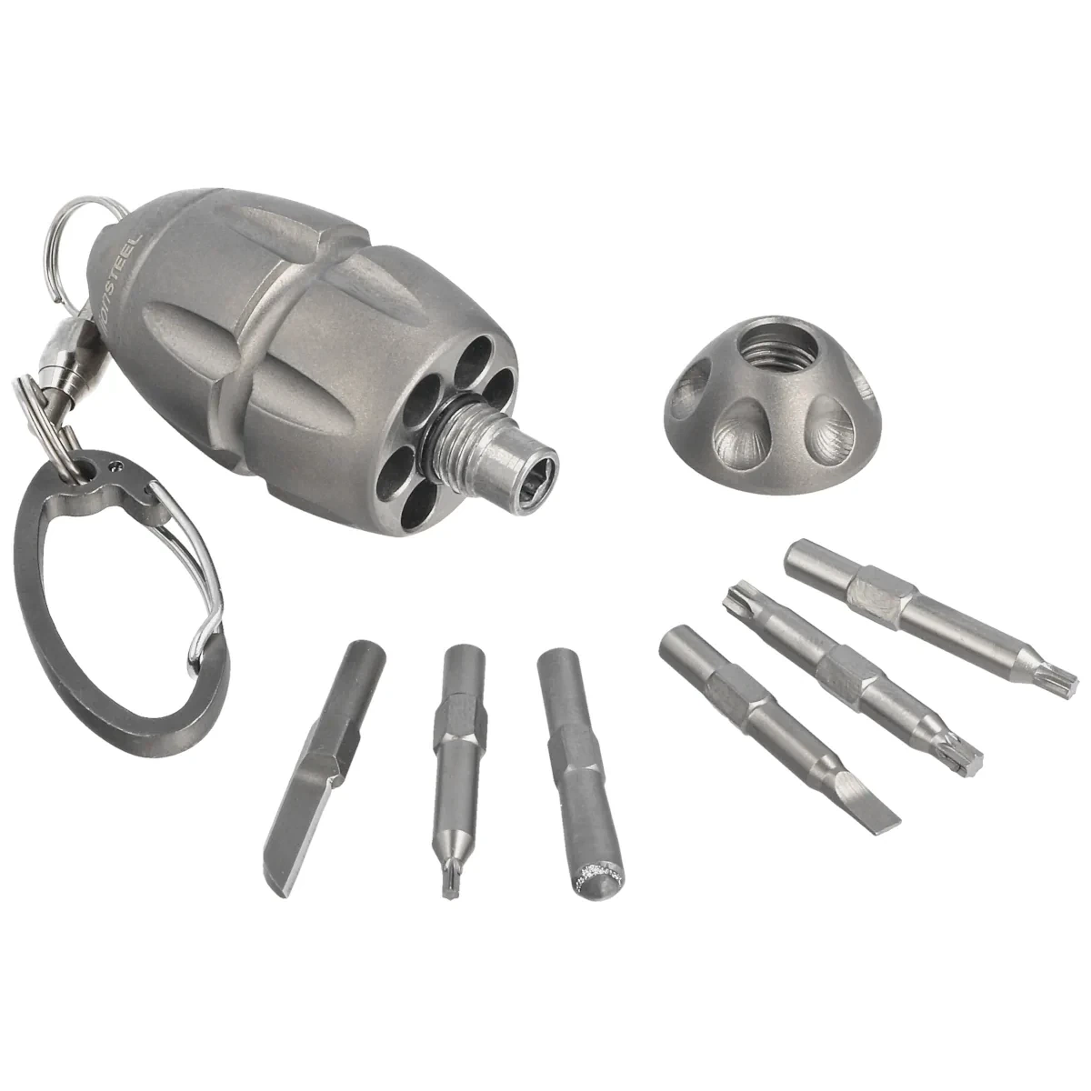 Eggie Grey Titanium, an indispensable EDC tool that you can always carry with you. An extremely functional keychain that holds up to seven tools, encased in a titanium case. Designed by well-known designer Ruslan Sarychev of Audacious Concept for LionSteel. Made of high quality titanium, which guarantees its strength and longevity. One of the advantages of this tool is a convenient snap hook, which allows you to easily attach it to your keys or backpack. This way you always have the necessary tools at hand, which can prove helpful when you least expect it. Among the tools that this product hides are torx bits in three sizes, a flathead screwdriver bit, a small blade and a carbide tip for breaking glass. The central socket is equipped with a magnet, so the tool remains stable while in use. Whether you're an outdoor enthusiast or simply appreciate functionality and elegance, this keychain is sure to meet your expectations.