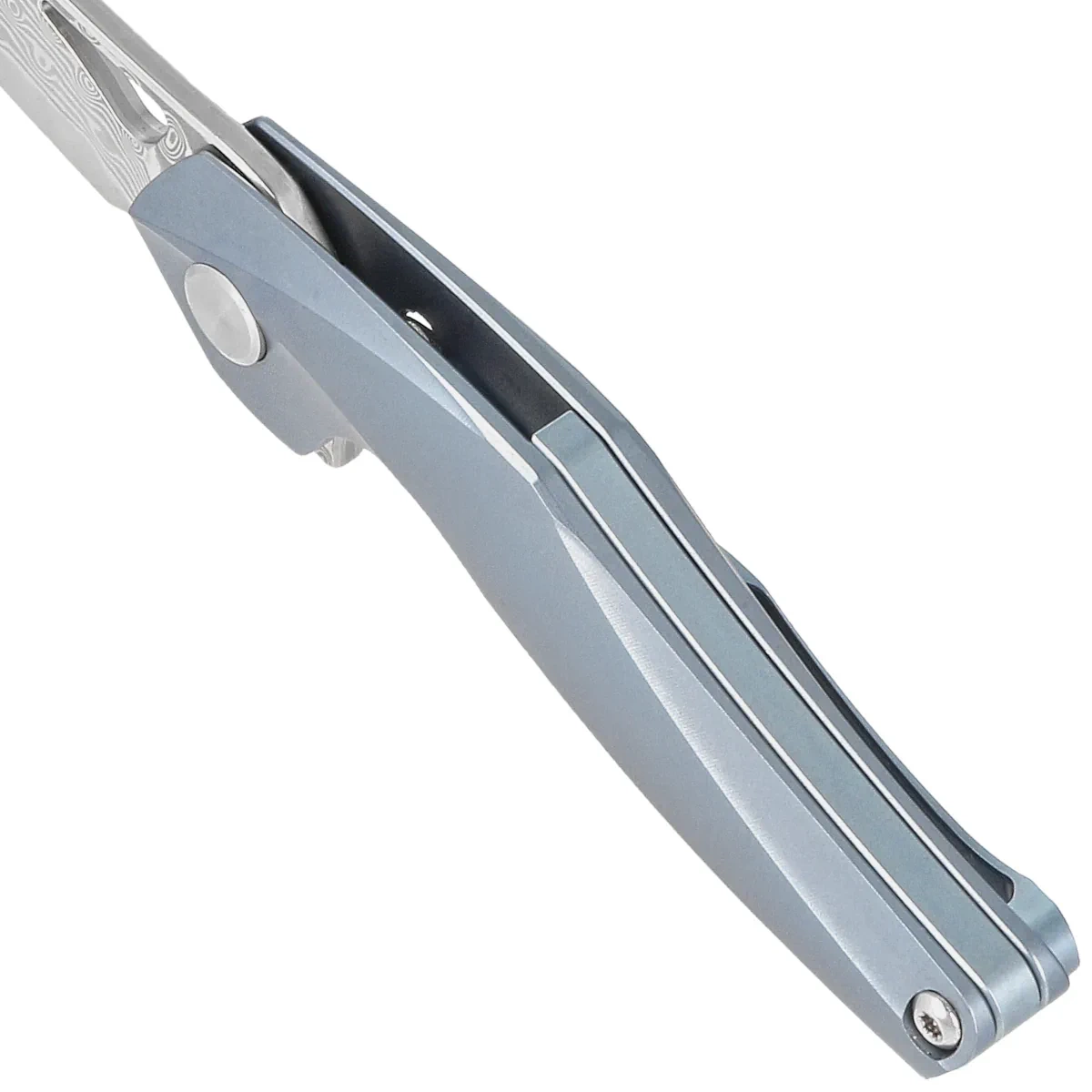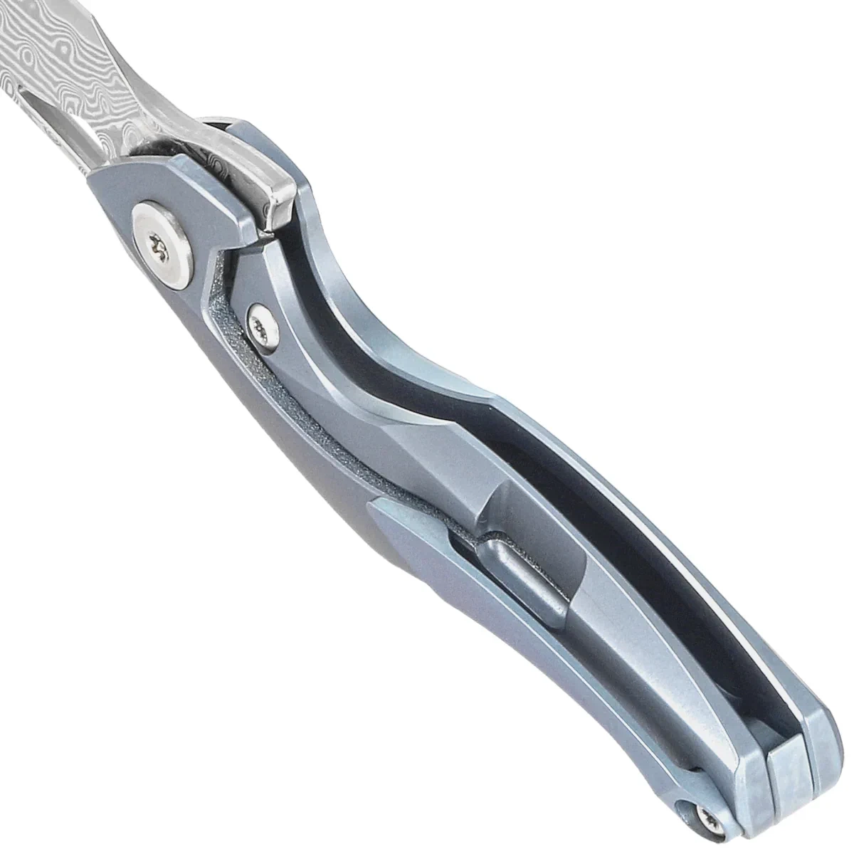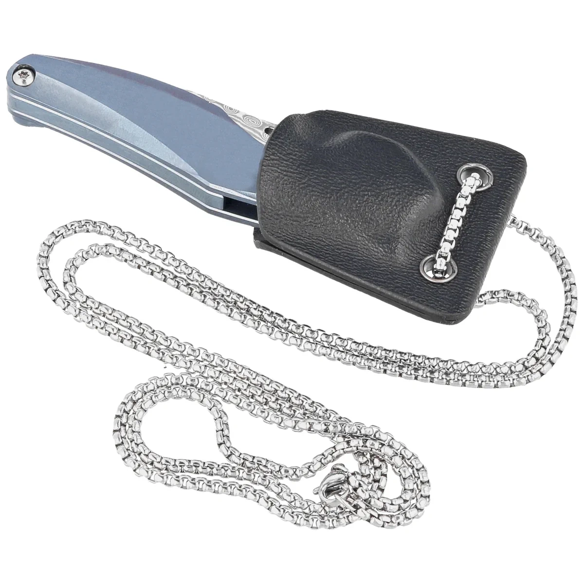 The Reticulan Blue Titanium, Damascus an undersized, elegant folding knife with a sheath suitable for hanging around the neck. Designed by renowned knifemaker and designer Elijah Isham. The appearance of The Reticulan clearly highlights Elijah Isham's design style. His designs are often enhanced with artistic organic shapes and wavy lines. Without a doubt, The Reticulan is an extraordinary knife that will make you stand out from the crowd!
