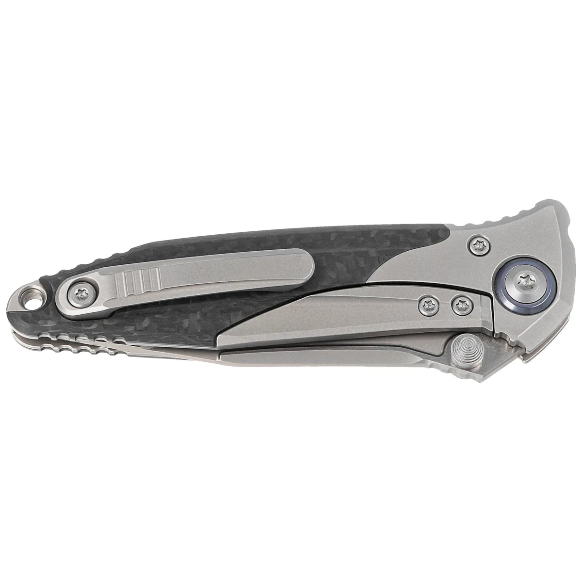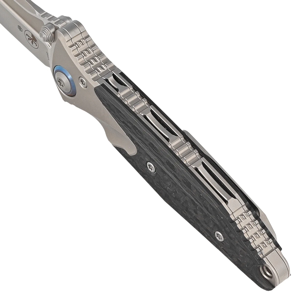 Handle - made with perfect precision in 3D technology on CNC milling machines from titanium. Perfectly fitted inlays (inlay) of Carbon Fiber composite make the knife does not slip in the hand during use. There are notches (jimping) on the back of the Handle for a more secure grip. The ergonomic profile and milled single-position (right) solid clip, allow the knife to be carried discreetly in the pocket, in tip-up(blade tip up) position. The pivot axis decorated with a blue rim (pivot collar cap). In the back there is a lanyard hole, a place for a safety or decorative cord. The protruding section of the titanium frame can be used as an improvised glass breaker.