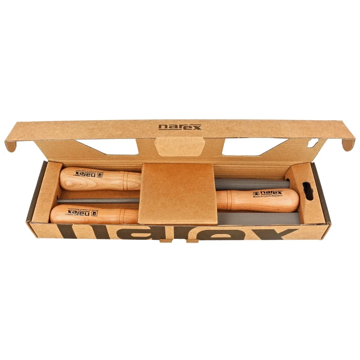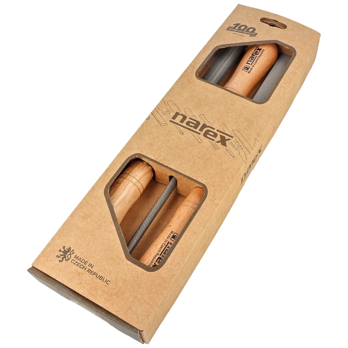 - High-quality 200 mm metal files from the Czech brand Narex. The set includes three file types – flat, half-round, and round. Made from high-carbon tool steel, hardened to a hardness of 62 HRC. Traditional handle crafted from durable beech wood.