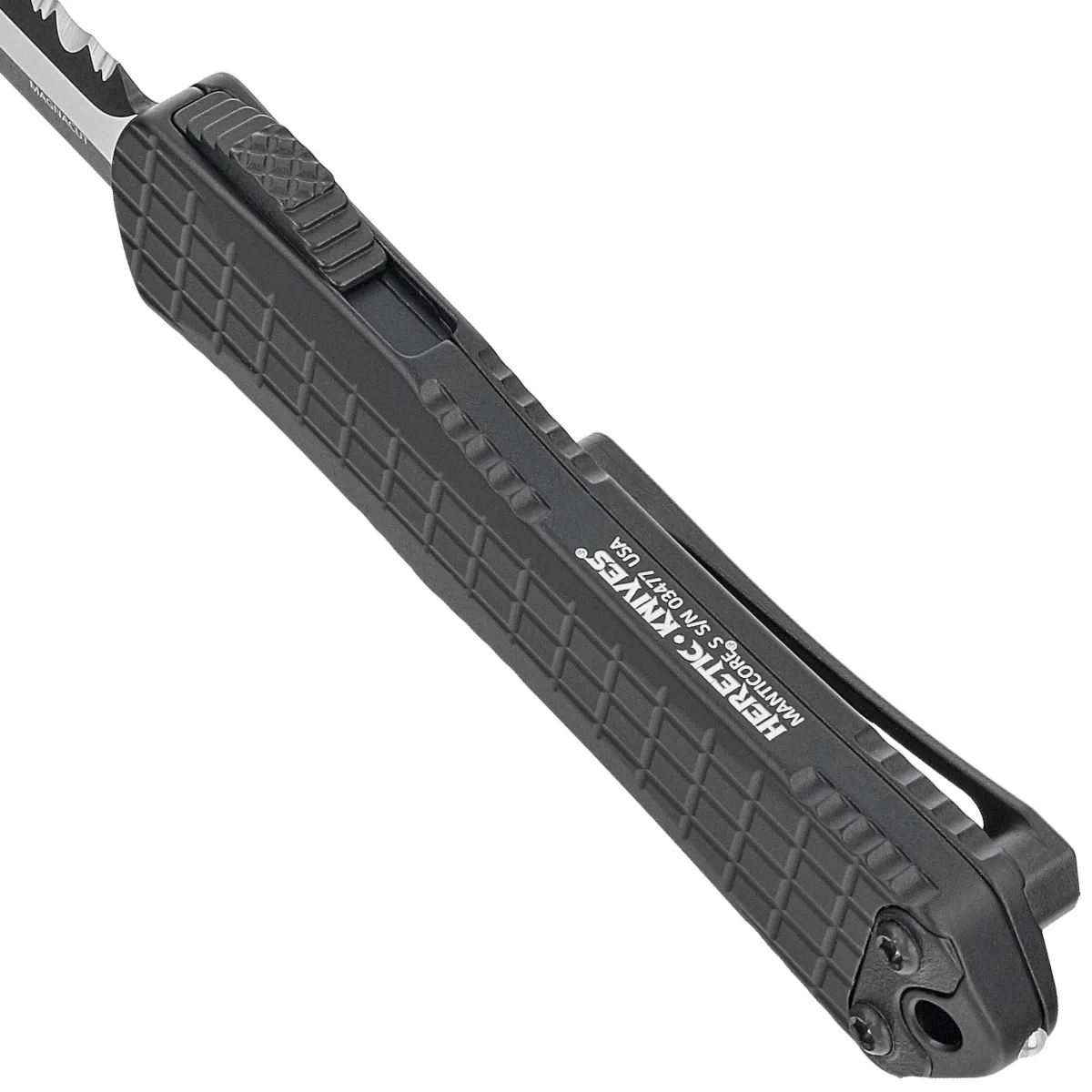 Manticore S D/E Black Frag Aluminum, P/S Black/Satin ultralight and compact automatic knife. Equipped with a hellishly fast mechanism that extends the razor-sharp blade. 100% made and assembled in the USA. Designed by Anthony Marfione Jr. knifemaker and owner of Heretic Knives.