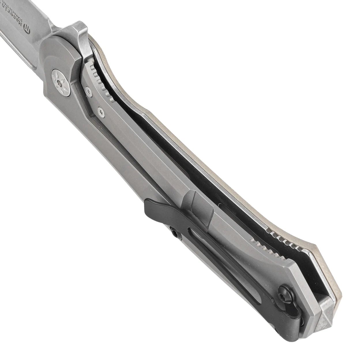 Handle - presentation side made of G10 (fiberglass compressed with synthetic resin). Locking side made of titanium To stiffen the structure bolted to a solid backspacer ending in a skull crusher. Simple, solid construction gives you the assurance of many years of use. A single-position right-handed metal deep-carry clip allows you to carry the knife discreetly in your pocket in tip-up position (blade tip up). An additional accessory is a nylon case for carrying the knife.