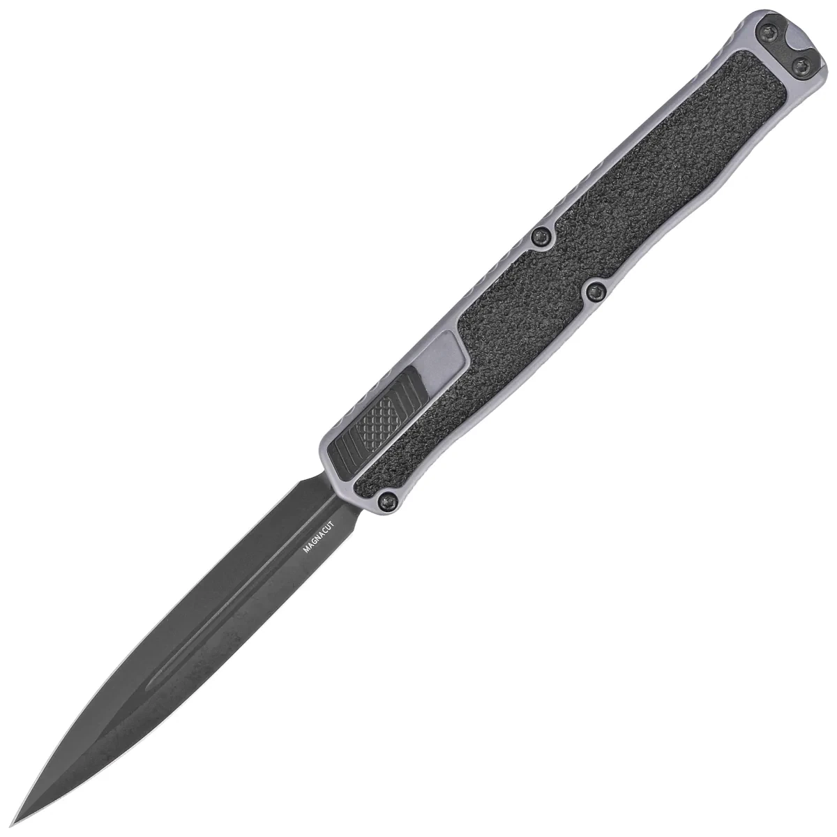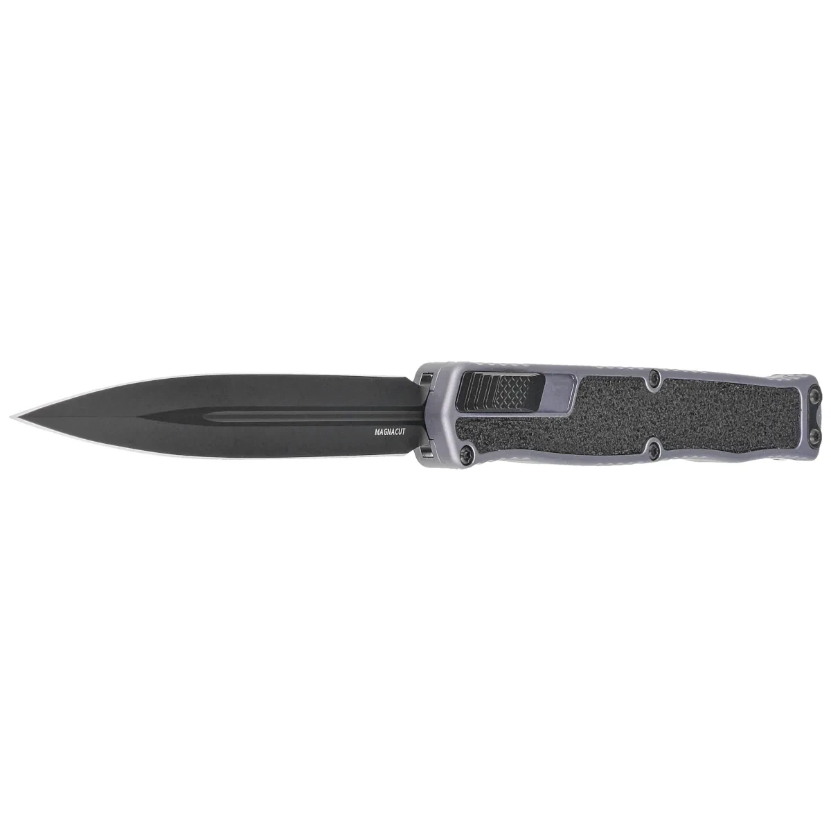 Blade - machine ground D/E (Double Edge Dagger) type with a double-edged symmetrical blade coated with black DLC coating. The blade was derived with a high flat grind (Flat Grind), providing excellent cutting properties. The centrally placed grain grooves (blood-draining slots) increase the Blade's strength. As a result, while retaining its strength, the knife has excellent piercing properties. The mechanism of extending / retracting the blade by means of a moled stepped Thumb Slide requiring for safety the application of a specific force to overcome the resistance of the spring.