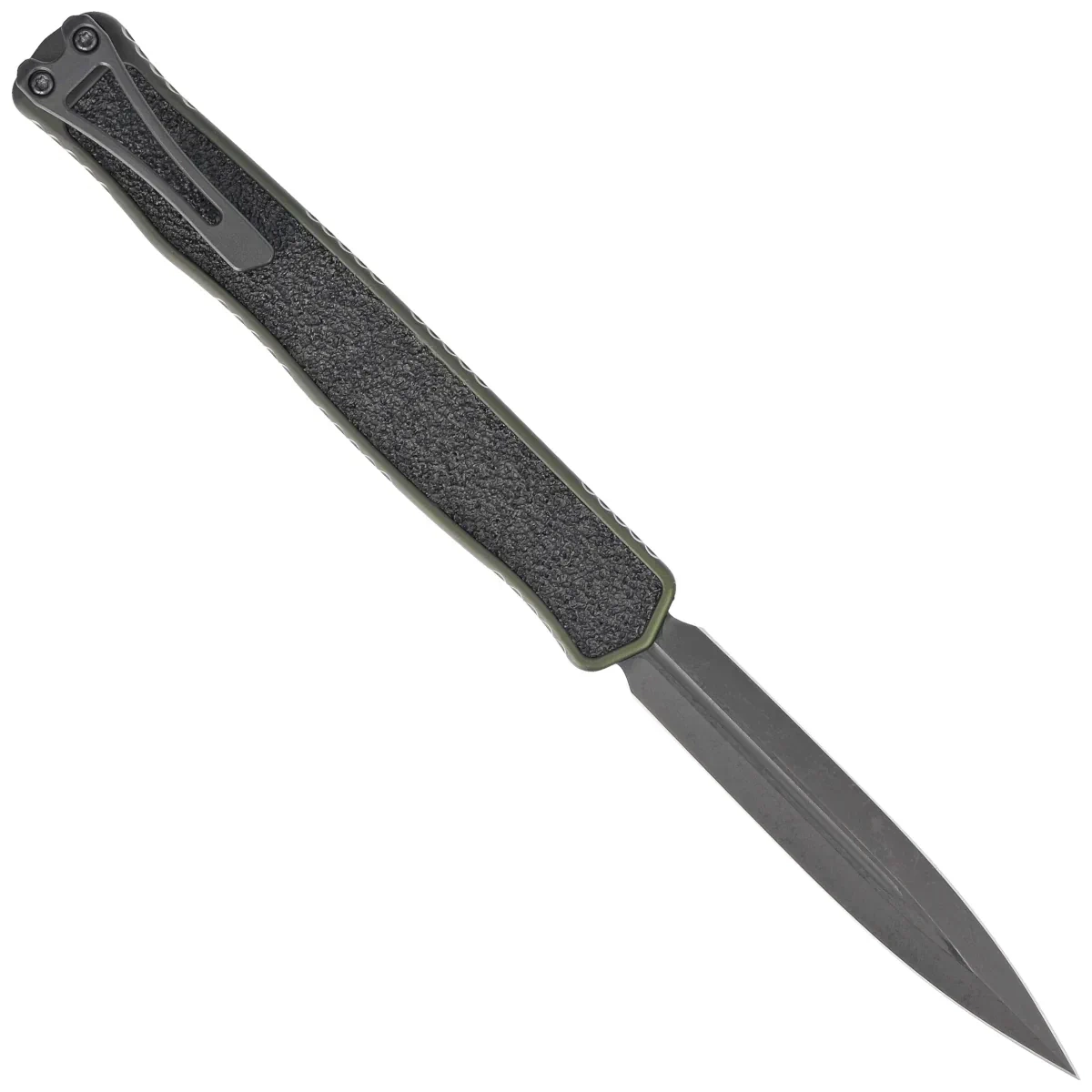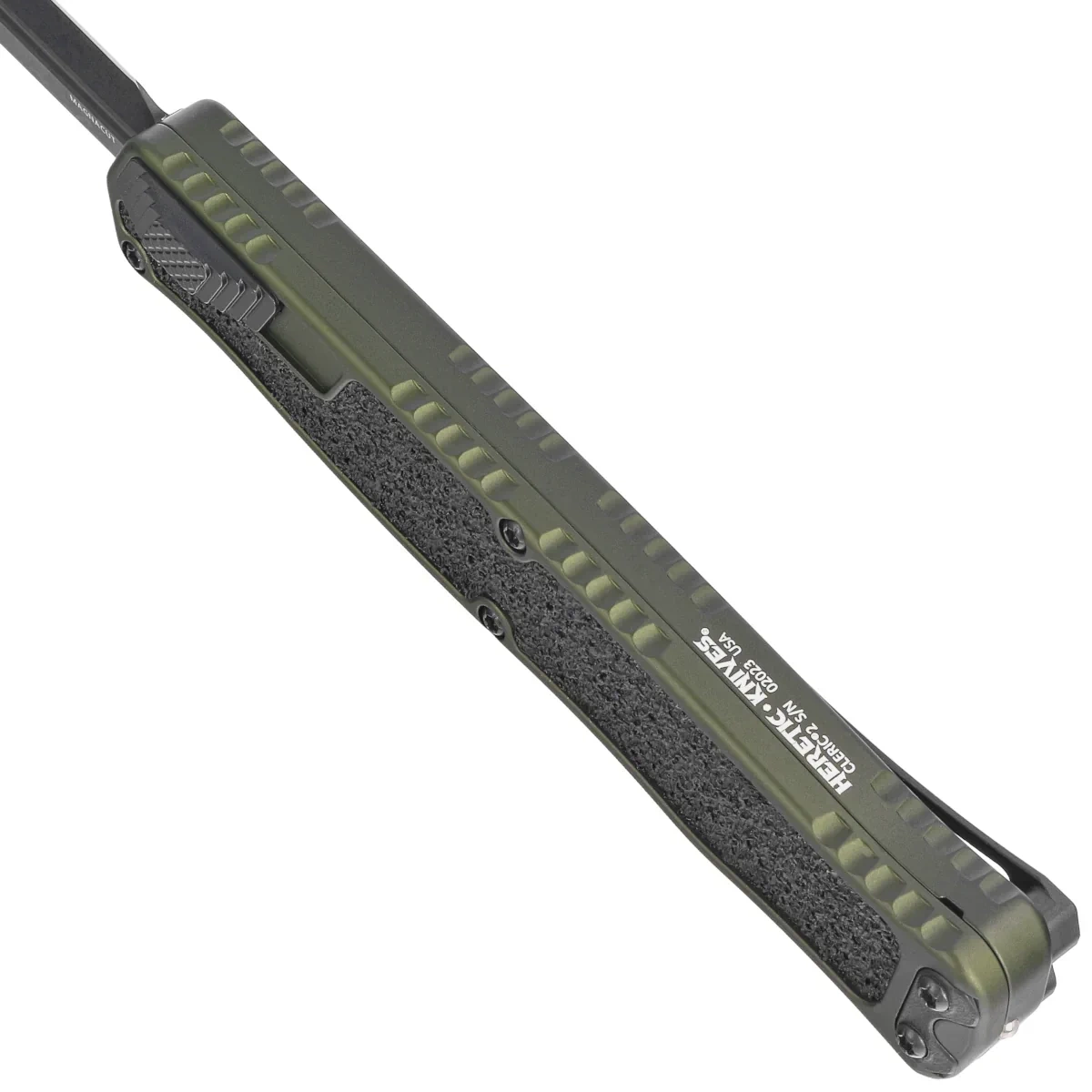 - Cleric II D/E OD Green Aluminum, Black DLC. An OTF automatic knife that stands out among the rest. D/A working automatic with a slim profile with super smooth opening and closing action. Customized by Tony Marfione Jr, Heretic Knives