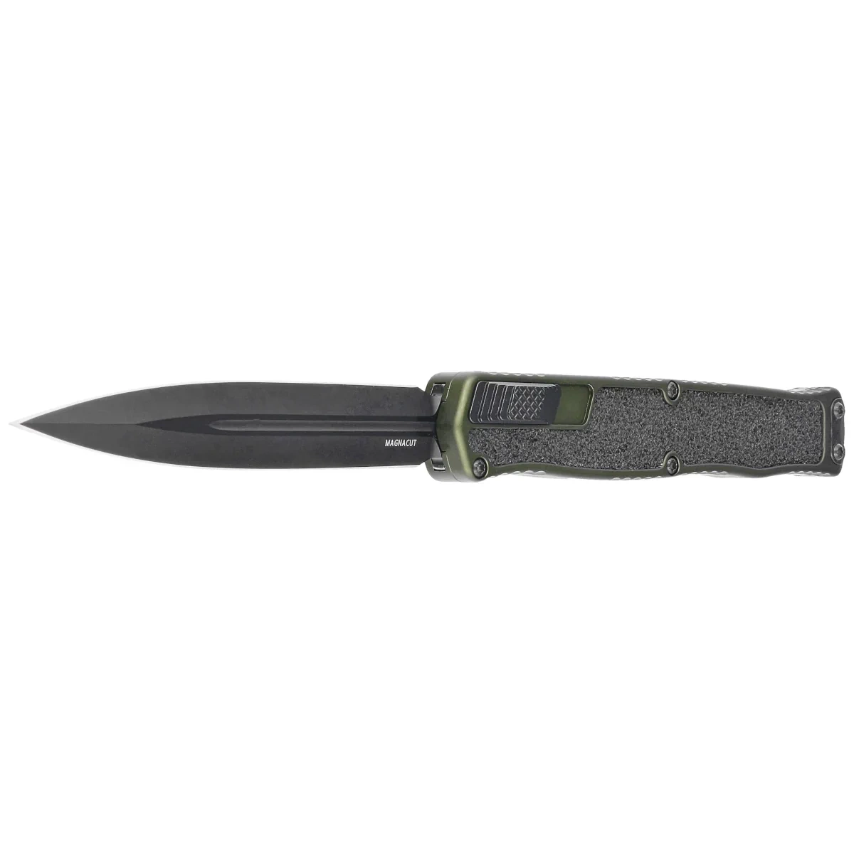 Blade - machine ground D/E (Double Edge Dagger) type with a double-edged symmetrical blade coated with black DLC coating. The blade was derived with a high flat grind (Flat Grind), providing excellent cutting properties. The centrally placed grain grooves (blood-draining slots) increase the Blade's strength. As a result, while retaining its strength, the knife has excellent piercing properties. The mechanism of extending / retracting the blade by means of a moled stepped Thumb Slide requiring for safety the application of a specific force to overcome the resistance of the spring.