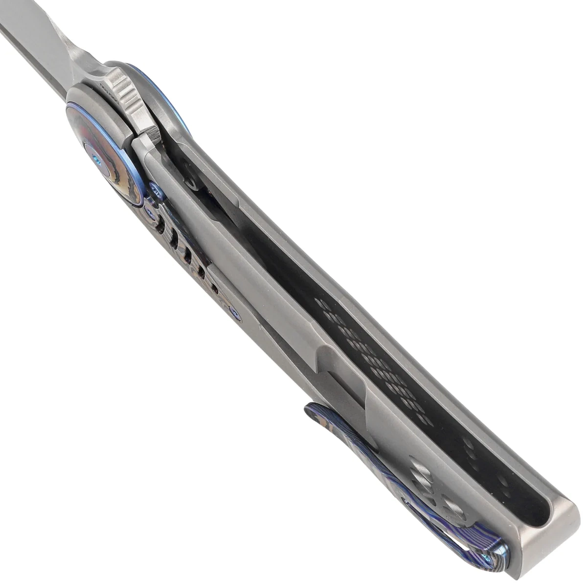 Handle - made of a single piece of titanium 6AI4V, processed on CNC milling machines. A monolithic body of the highest strength, which is a solid structural element guaranteeing the rigidity and strength of the entire structure. Only a few companies are able to make a handle with such incredible accuracy! The simplicity and robustness of the design ensure many years of use. Single position clip (right), made of zircuta (titanium damast and zirconium), allows the knife to be carried in a tip-up position. Pivot axis decorated with a blue rim (pivot collar cap) and an elaborately integrated zircuta inlay.