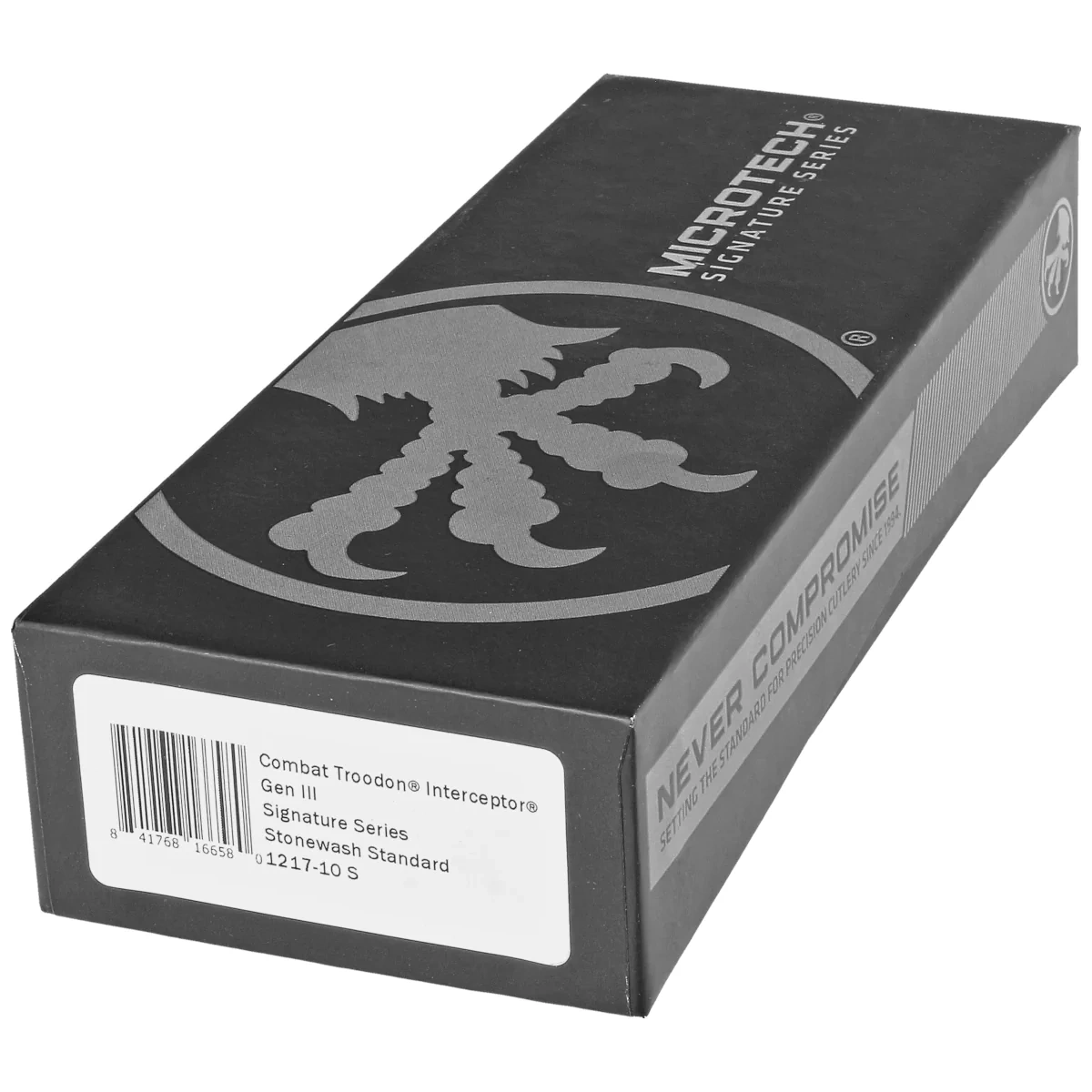 Combat Troodon Gen III Interceptor Signature Black Aluminum, Stonewashed is the largest of the automatic knives, representing the pinnacle of precision engineering and tactical efficiency in the realm of OTF (Out The Front) knives. Designed for a wide range of utility applications, it boasts a size 25% larger than the flagship Troodon. Meticulously crafted, it features a sophisticated and lightning-fast deployment mechanism for the razor-sharp, newly designed Interceptor blade. 100% made and assembled in the USA. The design is by Anthony Marfione, knifemaker and owner of Microtech Knives.