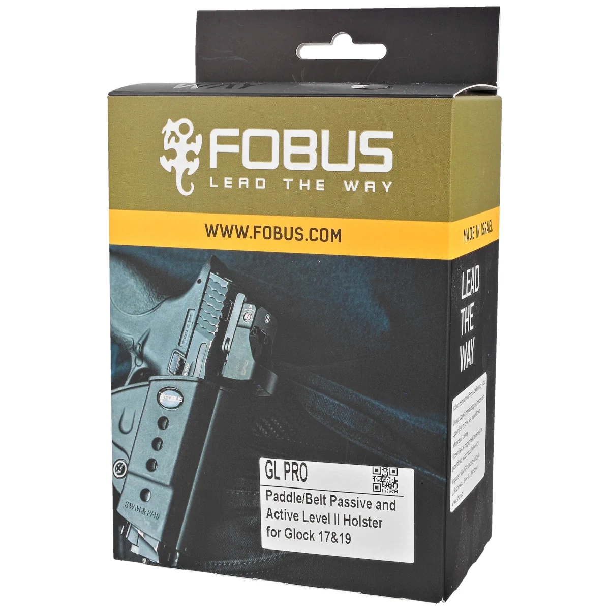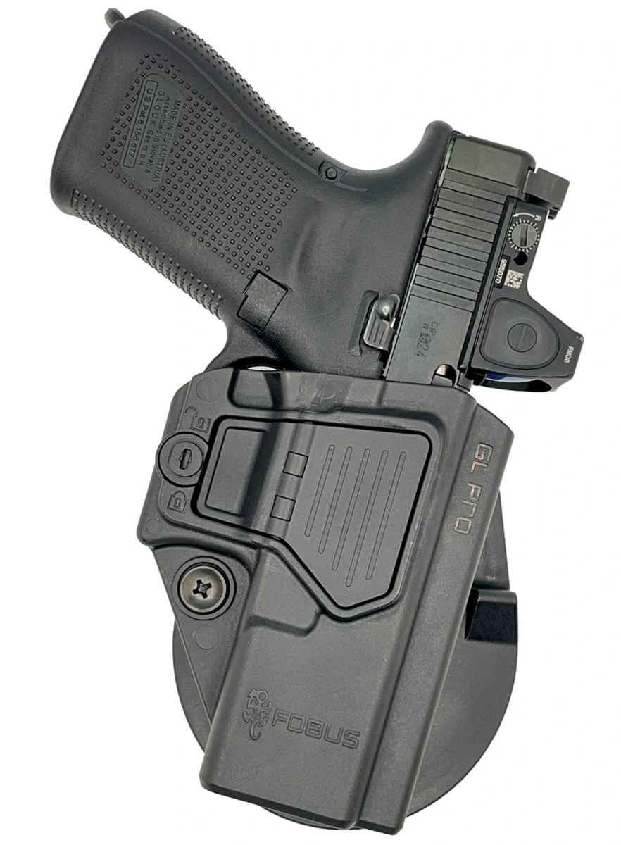 • GLPRO (Paddle) open holster by Fobus - right-handed. For Glock 17, 19, 19X, 26, 45. Low-profile OWB holster with active/pasive retention switch and adjustable passive retention. Red dot and high front sight ready.