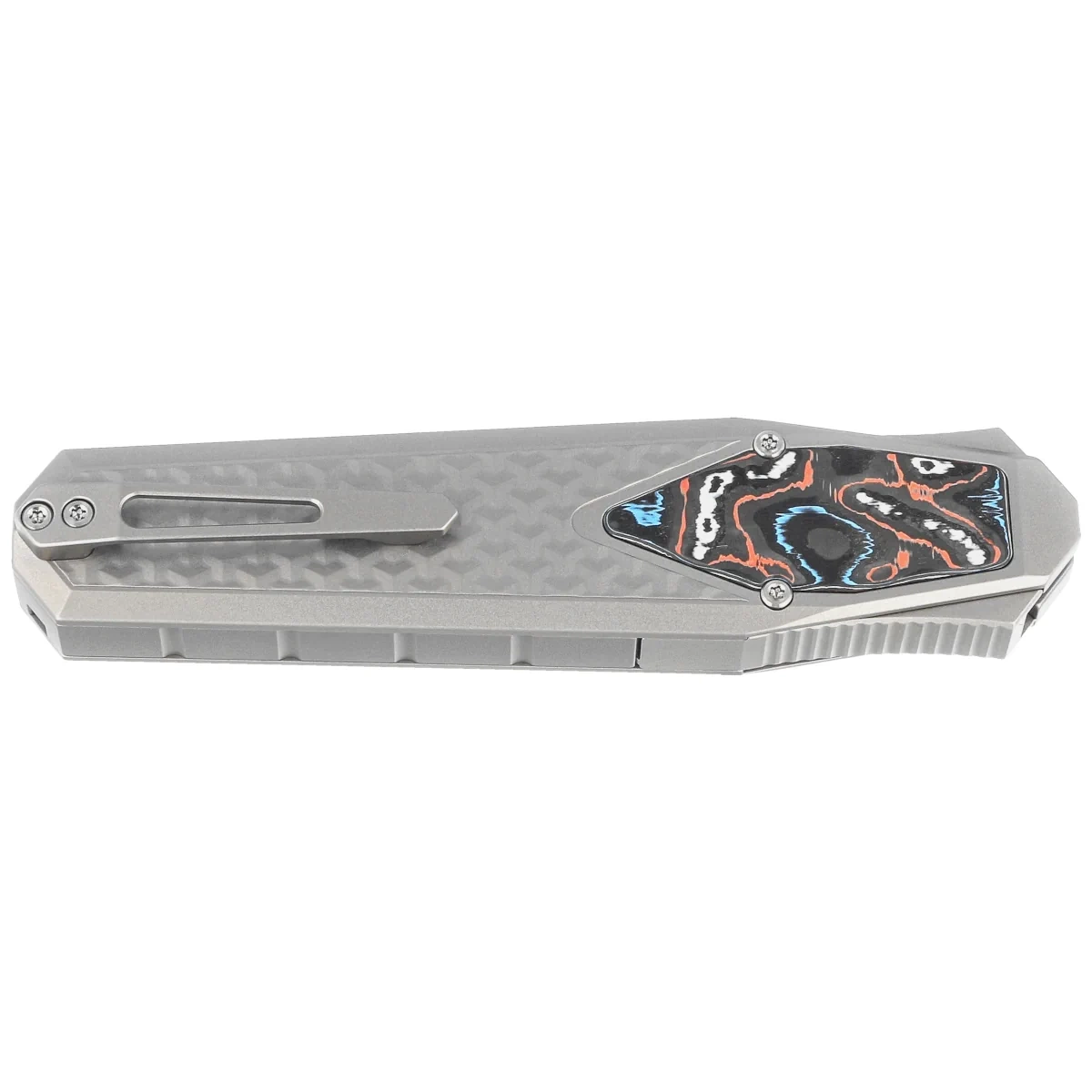 Handle - made on CNC milling machines from titanium, with three-dimensional texture. The chamfered edges of the covers eliminate sharp edges, and the perfectly matched inlay (inlay) made of red-blue Carbon Fiber composite add an exclusive touch and improve grip security. On the right side, an artful slide for advancing/retracting the blade. A single-position titanium (right) deep-carry clip allows the knife to be carried discreetly in a pocket in tip-down position (blade tip down).