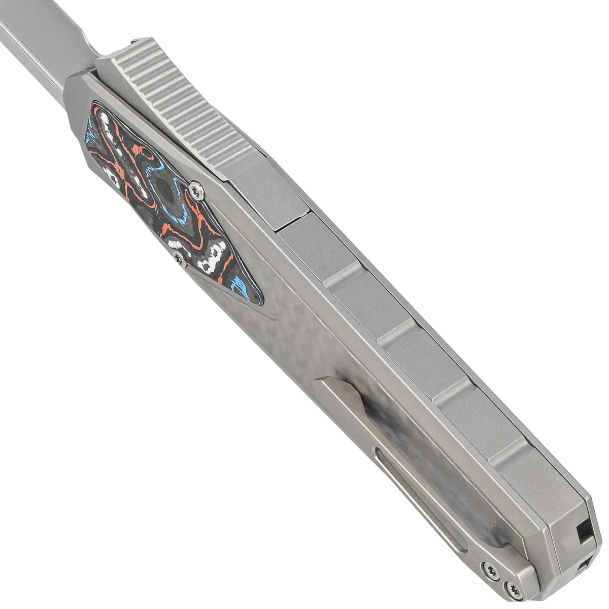 Swordfish Titanium / Red Blue Carbon Fiber, Pearlescent opening intuitive folding knife from the up-and-coming Remette Knives manufactory, a display of engineering in design. Gravity OTF (Out The Front) Blade extends from the front due to the force of gravity. Modeled on the design of the Luftwaffe gravity air knife, commonly known as the knife of German paratroopers. Intuitive extension / retraction of the blade with one hand (under the influence of gravity) and the best materials such as Böhler M390 blade steel and titanium handle, perfectly combined with the unmatched quality of the Remette brand !