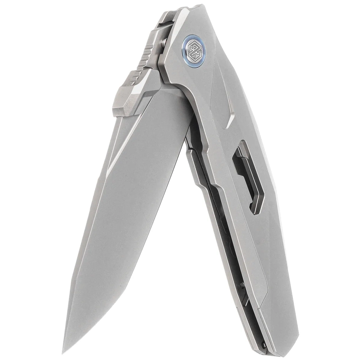 Handle - an exoskeleton made of titanium 6AL4V on which is mounted a monolithic housing beautifully milled with the help of CNC machine tools from a single piece of titanium. The innovative design provides outstanding solidity and resistance. In the rear part you will find a locking slide, thanks to it you have the possibility to remove the outer casing, for example, to clean the knife. The pivot axis decorated with a dyed titanium rim (pivot collar cap) and a stylized version of the company's logo.