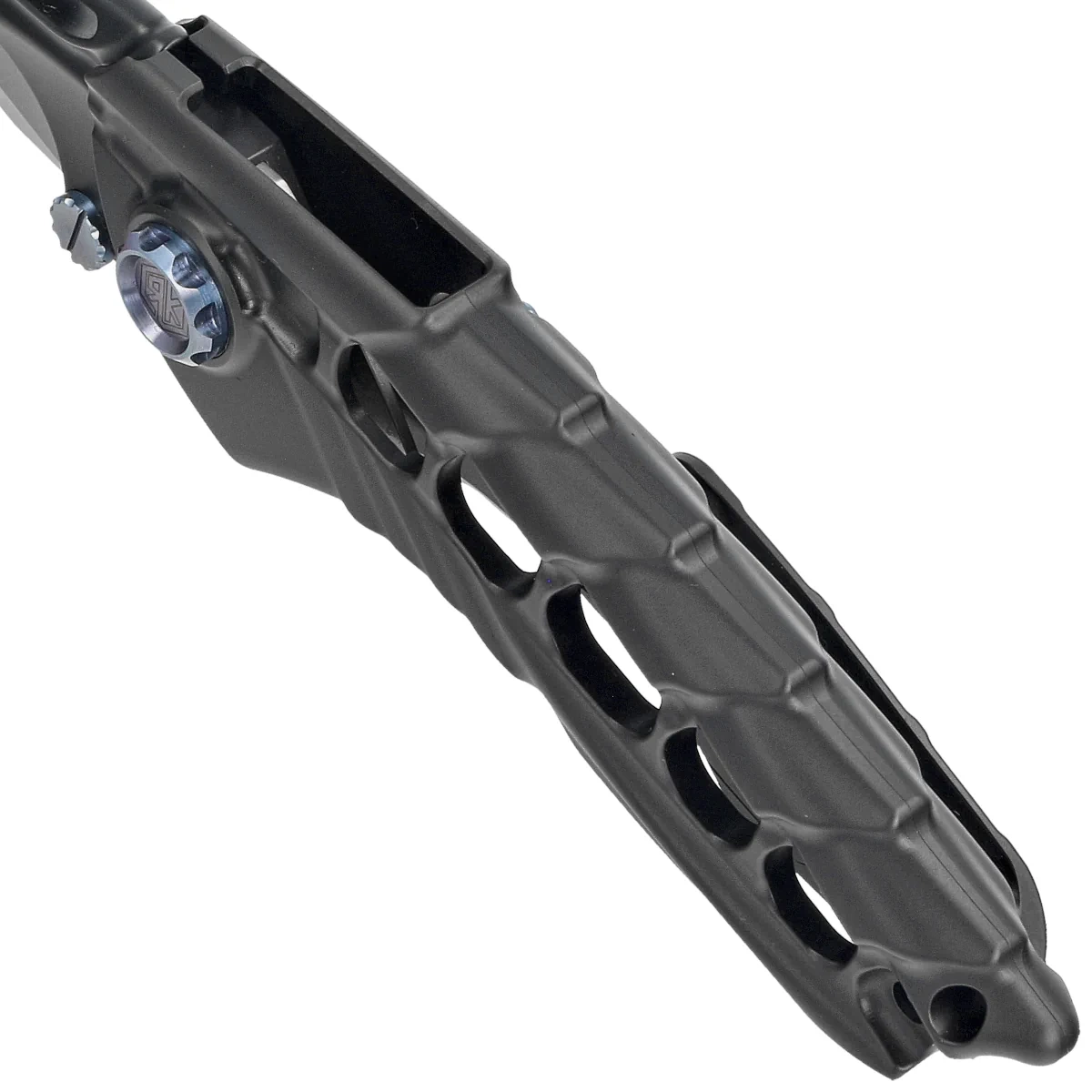Handle - monolithic, made from a single piece of 6AL4V titanium milled with 3D CNC machine tools, coated with black DLC. This provides incredible strength, but requires the highest skill and precision in production. Chamfered cover edges and fore finger groove eliminate sharp edges and improve ergonomics of the grip. On the back of the Handle, stylized circles which, with holes milled below, bring to mind a fragment of Alien's skeleton. The pivot is decorated with a stylized Rike Knife brand logo. A single-position (right) deep-carry clip equipped with a smooth rollerball, thanks to which the knife easily slides into the pocket without damaging its edges, allows you to carry the knife discreetly in your pocket in the tip-up position (with the tip of the blade up).