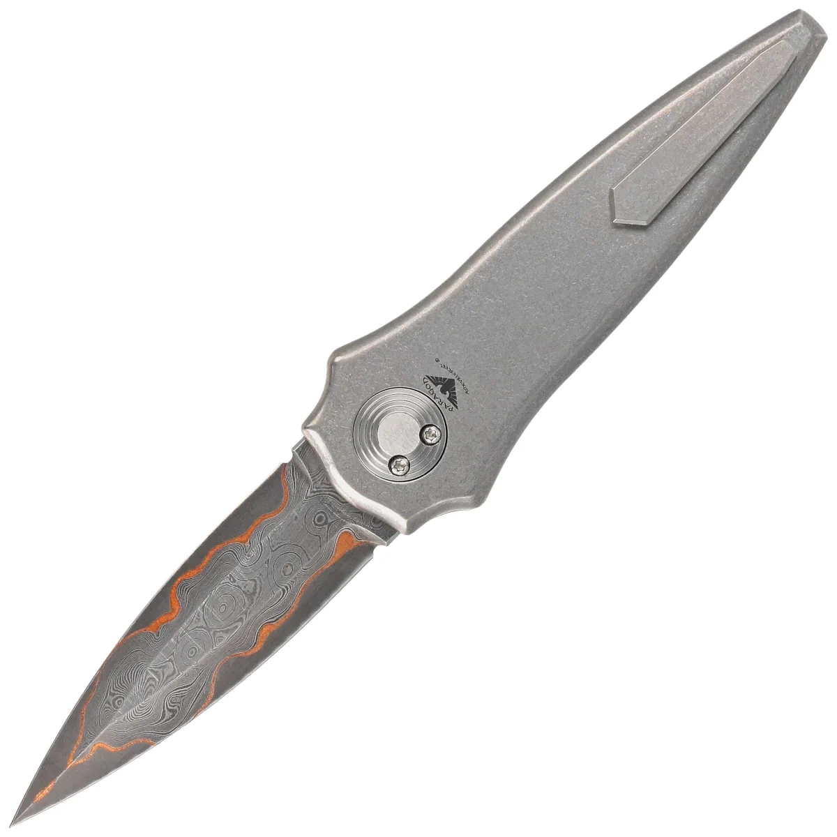 Warlock Smooth Gray Titanium, Damascus Baker Forge Raindrop Gomai Copper Shim 80CRV differs from traditional folding knives by using an innovative opening mechanism. The large, textured pivot serves as a double locking button. By pressing both sides of the pivot at the same time, the Handle splits, exposing the Blade; through gravity and wrist movement, the Blade will slide out to the open position. This is a fun and innovative opening mechanism, effective and also provides a solid lock. The Warlock knows how to get down to business and will work as long as you want it to, but it's also capable of satisfying your thirst for fun. It's a knife you'll always be happy to have with you.