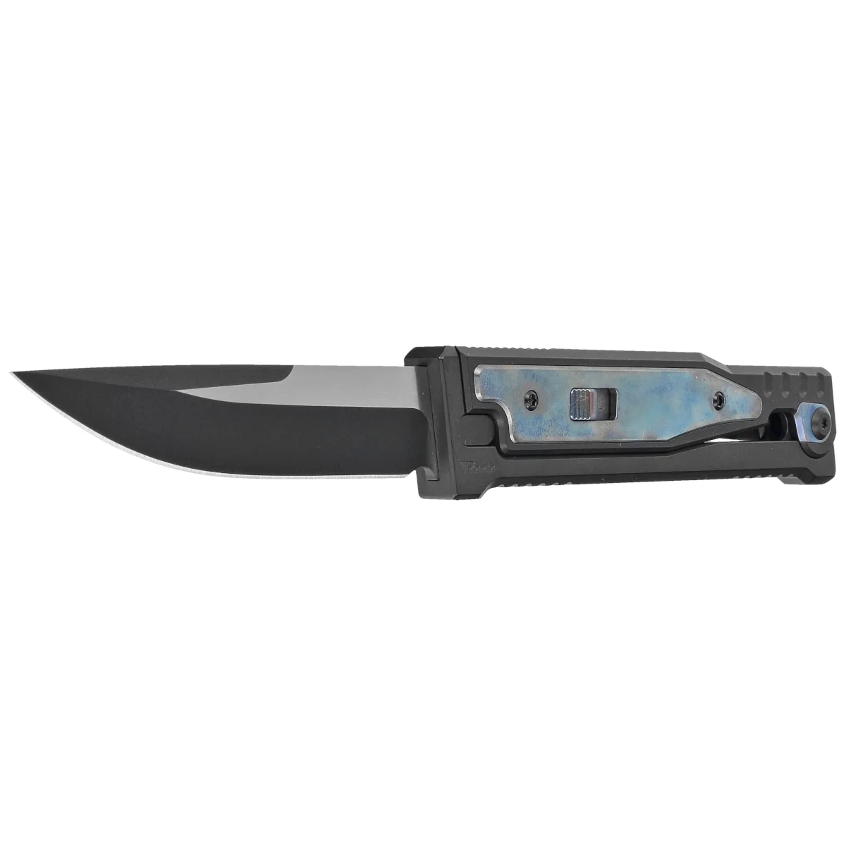 Handle - CNC-milled titanium Exoskeleton, an outer skeleton with a movable top section responsible for opening and closing the knife. The chamfered edges of the sheaths eliminate sharp edges, and the perfectly matched inserts made of heat-dyed titanium improve grip security. On the right side, an artful knife opening lock slider. Once it is moved to the secure "lock" position, the knife will not be opened/closed by accident. A single-position titanium (right) deep-carry clip allows you to discreetly carry the knife in your pocket in the tip-down position (blade tip down).