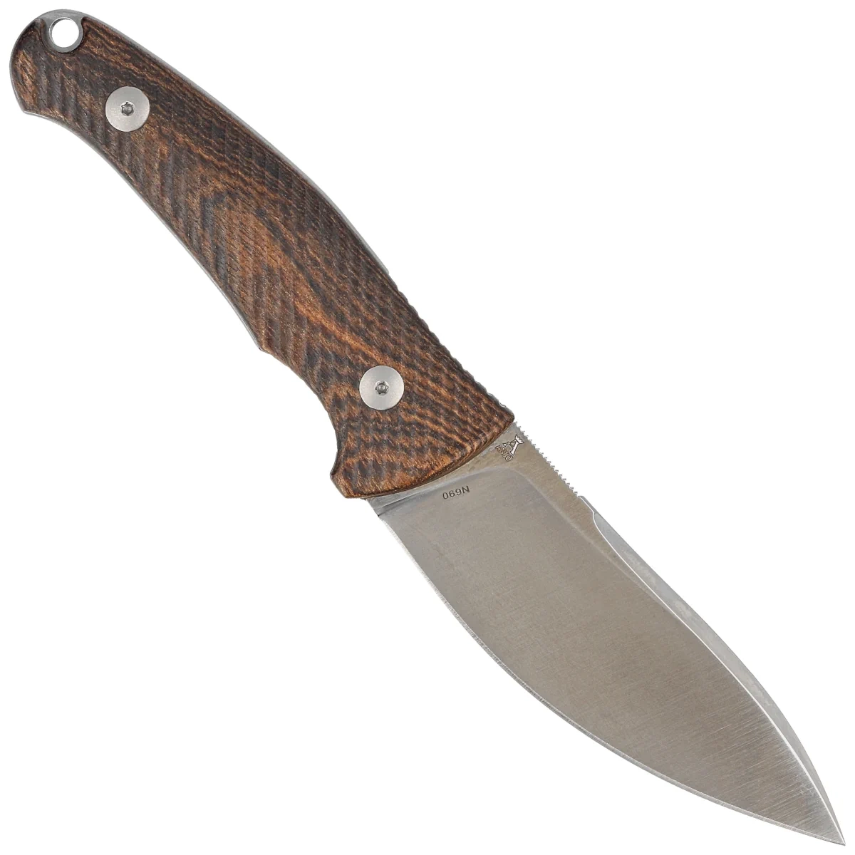 Handle - made of exotic Bocote wood with a beautiful grain pattern, screwed directly to the blade, which provides extraordinary durability of the construction. The rounded shape of the sheaths eliminates sharp edges. The unique ergonomics of the Handle allows the knife to be held both ways, especially for users who appreciate an inverted grip. On the back of the Handle a lanyard hole, which is a hole for attaching a belaying line.