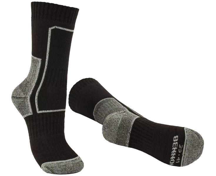 Trek Black/Grey professional, durable trekking socks with anatomically shaped and reinforced foot structure. Functional polypropylene knit fabric aids in moisture wicking. Pleasantly flexible and comfortable to wear. Reinforcements in the lower part of the socks increase resistance to abrasion and tearing, and the admixture of elastane ensures a good fit to the foot.