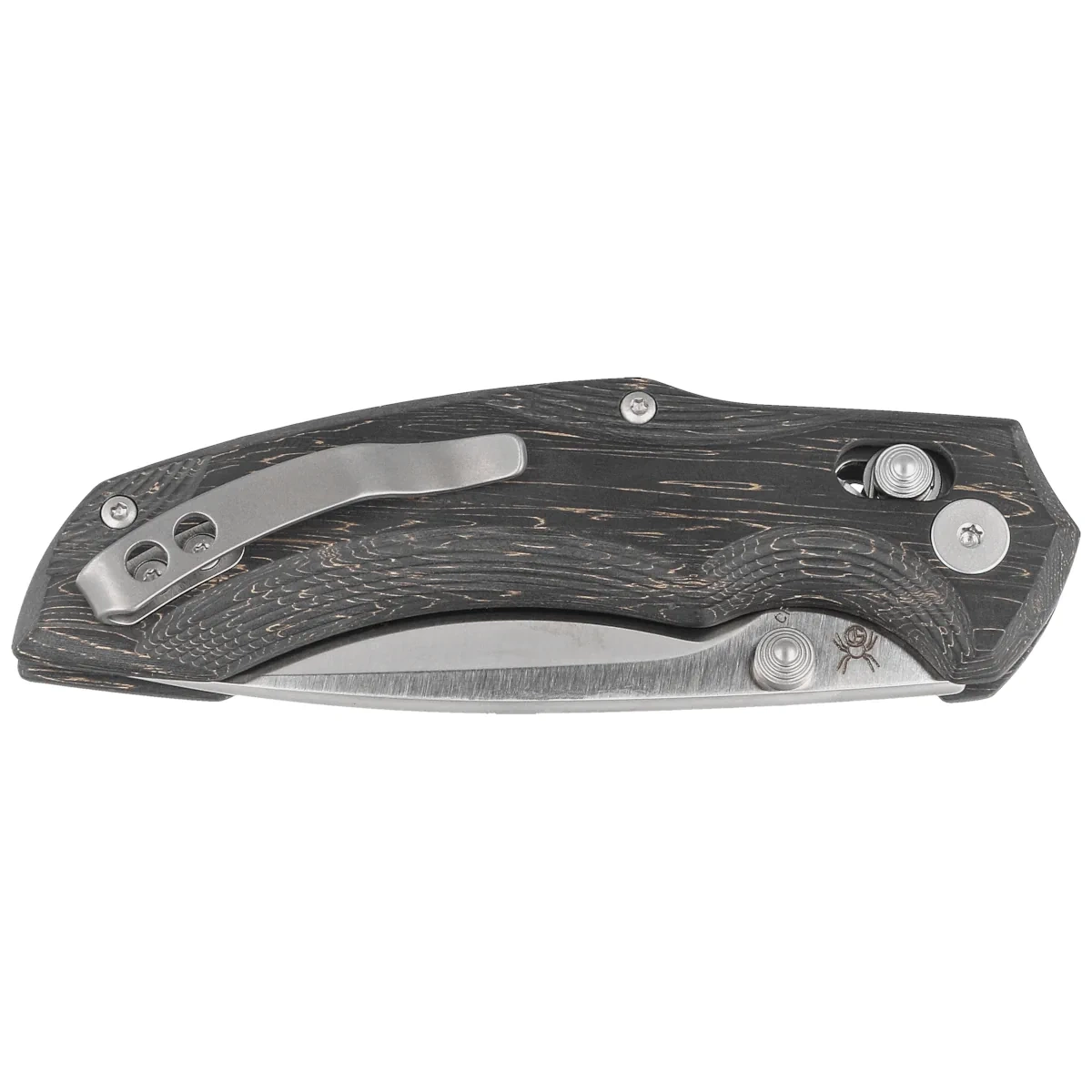 Handle - made of Light Carbon Fiber composite, a virtually indestructible plastic that is insensitive to weather, resistant to chemicals and mechanical damage, beautifully milled using CNC machine tools. The so-called open-backed design fixed with steel spacer sleeves reduces weight and facilitates cleaning. The simple, secure design gives assurance of many years of use. Single-position clip (right), made of titanium, allows the knife to be carried in tip-up position.