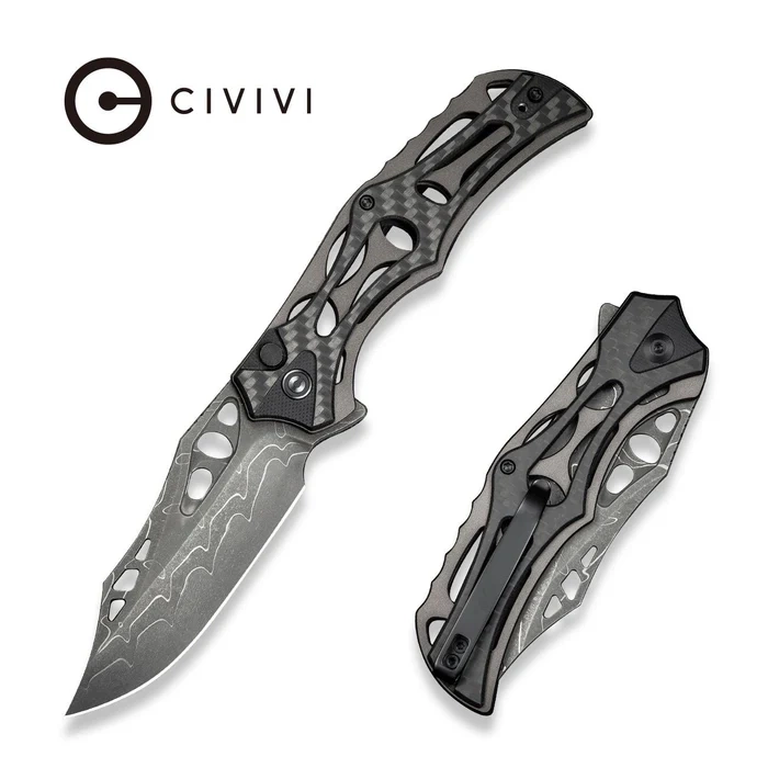 Handle - skeletonized, made of aluminum, to which heavily cut grips made of G10 composite covered with a layer of Twill Carbon Fiber were screwed. This gives the fingers plenty of support points for a secure grip. A fore finger groove made at the front improves ergonomics. The open-backed design fixed with steel spacer sleeves reduces weight and makes cleaning easier. The simple, secure design gives assurance of many years of use. Thanks to all these design measures, the full-size folder reaches a staggering 75g in weight. The pivot axis is adorned with a stylized Civivi brand logo. The two-position (right/left), deep-carry clip allows you to carry the knife discreetly in your pocket in tip-up position (blade tip up).