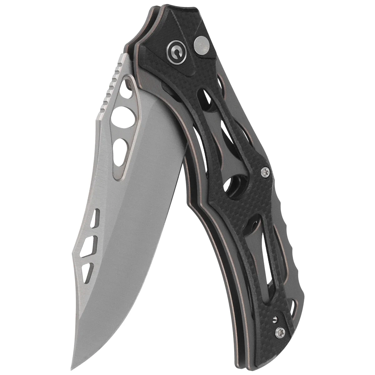 Handle - skeletonized, made of aluminum, to which heavily cut G10 composite grips were screwed. This gives the fingers plenty of support points for a secure grip. A fore finger groove made at the front improves ergonomics. The open-backed design, fixed with steel spacer sleeves, reduces weight and facilitates cleaning. The simple, secure design gives assurance of many years of use. Thanks to all these design measures, the full-size folder reaches a staggering 75g in weight. The pivot axis is adorned with a stylized Civivi brand logo . The two-position (right/left), deep-carry clip allows you to carry the knife discreetly in your pocket in tip-up position (blade tip up).