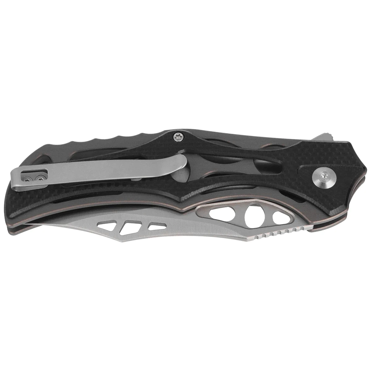 Blade - Clip Point type with a gently marked belly, finished in elegant satin. The small thickness of the blade, combined with concave grind (Hollow Grind), gives excellent cutting edge geometry and extreme cutting performance. The long false blade enhances the Blade's penetrating properties. Ceramic ball bearings support the smooth operation of the blade's opening mechanism, which can be opened with a quick flipper flipper (index-finger flipper), a hole in the blade (thumb hole) or by gravity. When opened, the flipper forms a mini-guard to prevent the hand from slipping on the blade. On the back of the upper jimping wedge, a notched thumb rest. The entire blade is locked with a solid button lock. Under the lock button there is a resisting spring, which prevents accidental release of the lock.